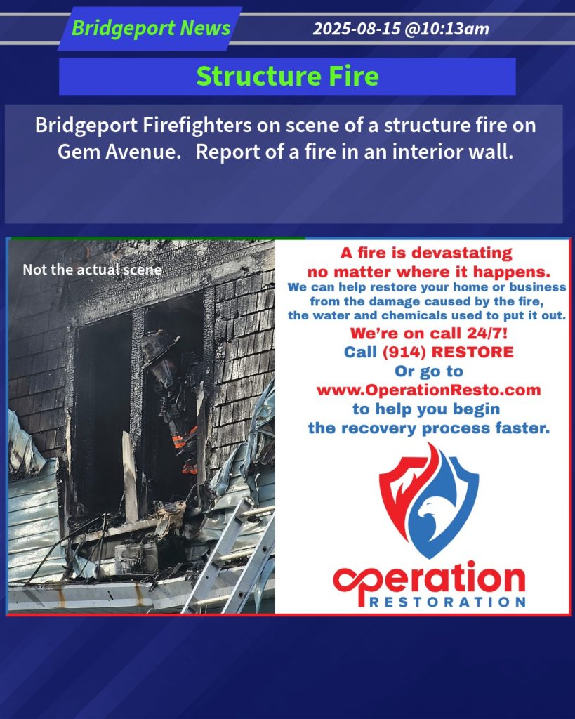 Bridgeport Firefighters are on the scene of a structure fire on Gem Avenue. Report of a fire in an interior wall.