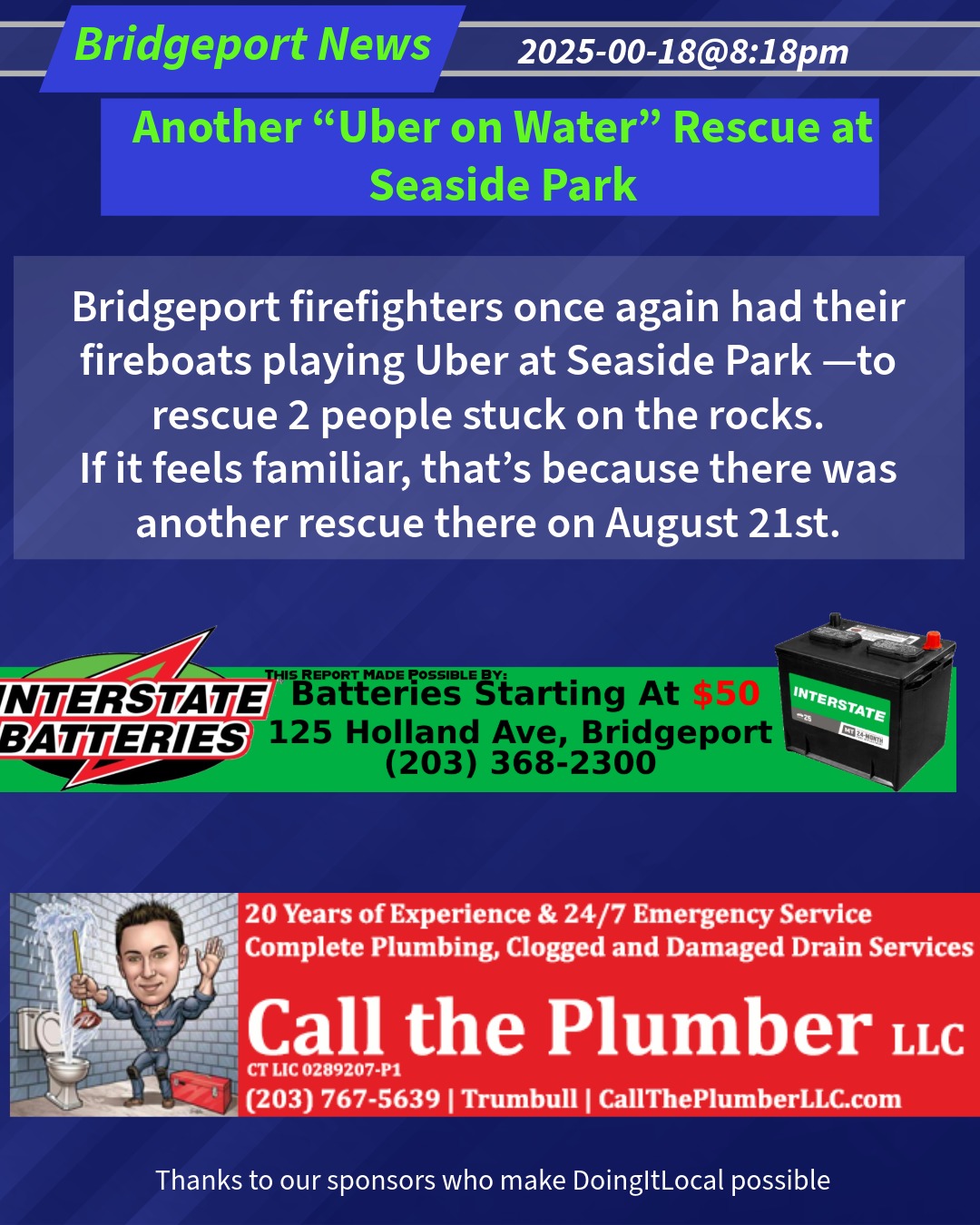 Bridgeport firefighters once again had their fireboats playing Uber at Seaside Park —this time rescuing two people stuck on the rocks.
