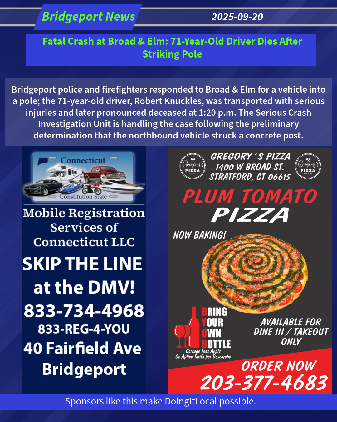 At about 12:44 p.m. on Sept. 20, 2025, Bridgeport EOC received multiple 911 calls for a crash at Broad St. and Elm St. involving a black vehicle into a pole with airbags deployed and an unresponsive male. AMR, Bridgeport Fire Engine 1, and Bridgeport Police responded; first responders provided immediate medical aid and transported the driver to St. Vincent’s Medical Center with serious injuries. The scene was secured and the Serious Crash Investigation Unit responded. Preliminary investigation indicates 71-year-old Robert Knuckles of Bridgeport was traveling north on Broad Street in a 2020 Acura RLX when he struck a concrete post at the intersection; he was pronounced deceased at 1:20 p.m. The Bridgeport Police Department offered condolences to Mr. Knuckles’ family and friends.