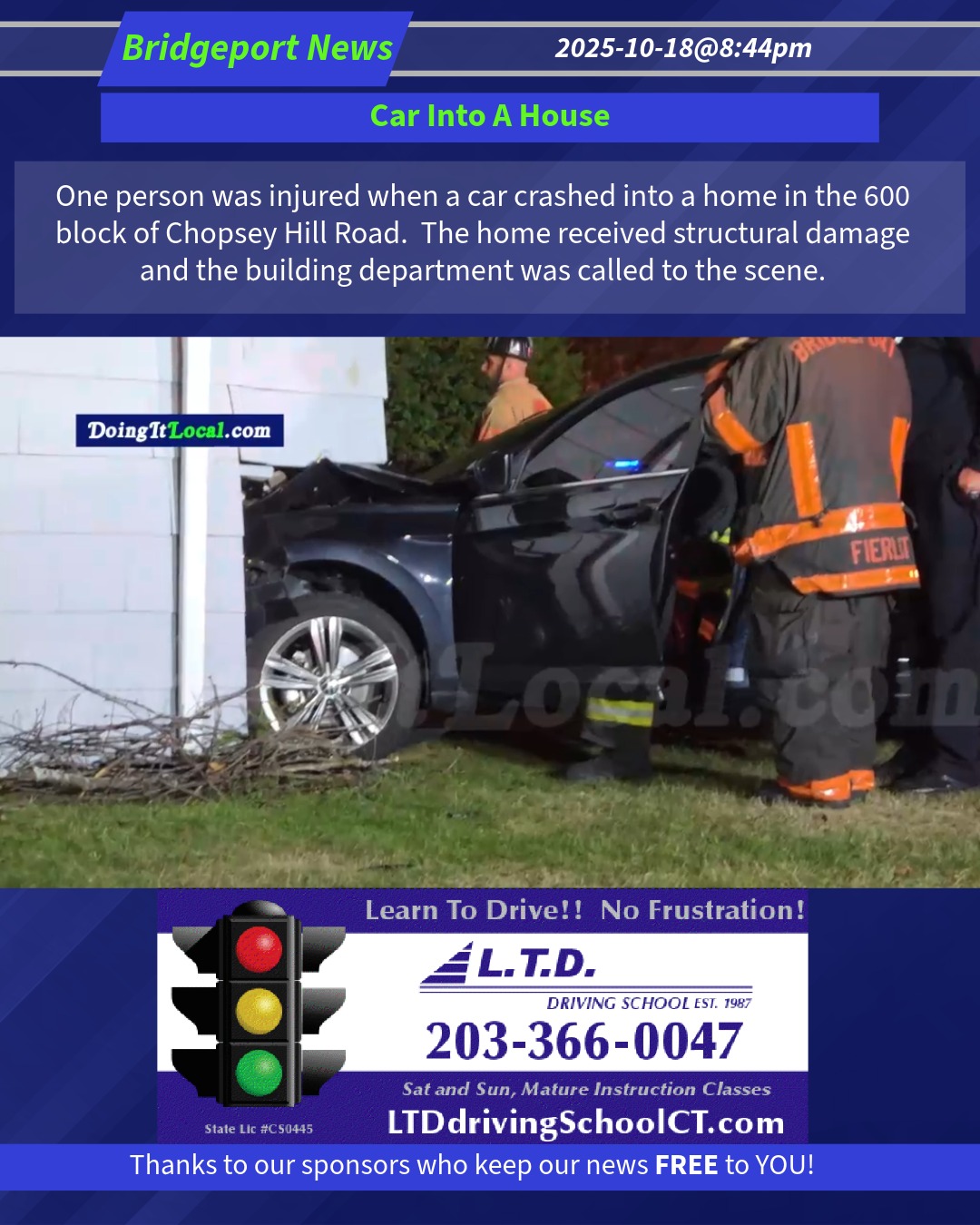 One person was injured when a car crashed into a home in the 600 block of Chopsey Hill Road. The home received structural damage, and the building department was called to the scene.