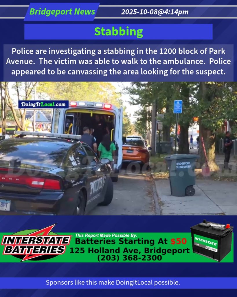 Police are investigating a stabbing in the 1200 block of Park Avenue. The victim was able to walk to the ambulance. Police appeared to be canvassing the area looking for the suspect.