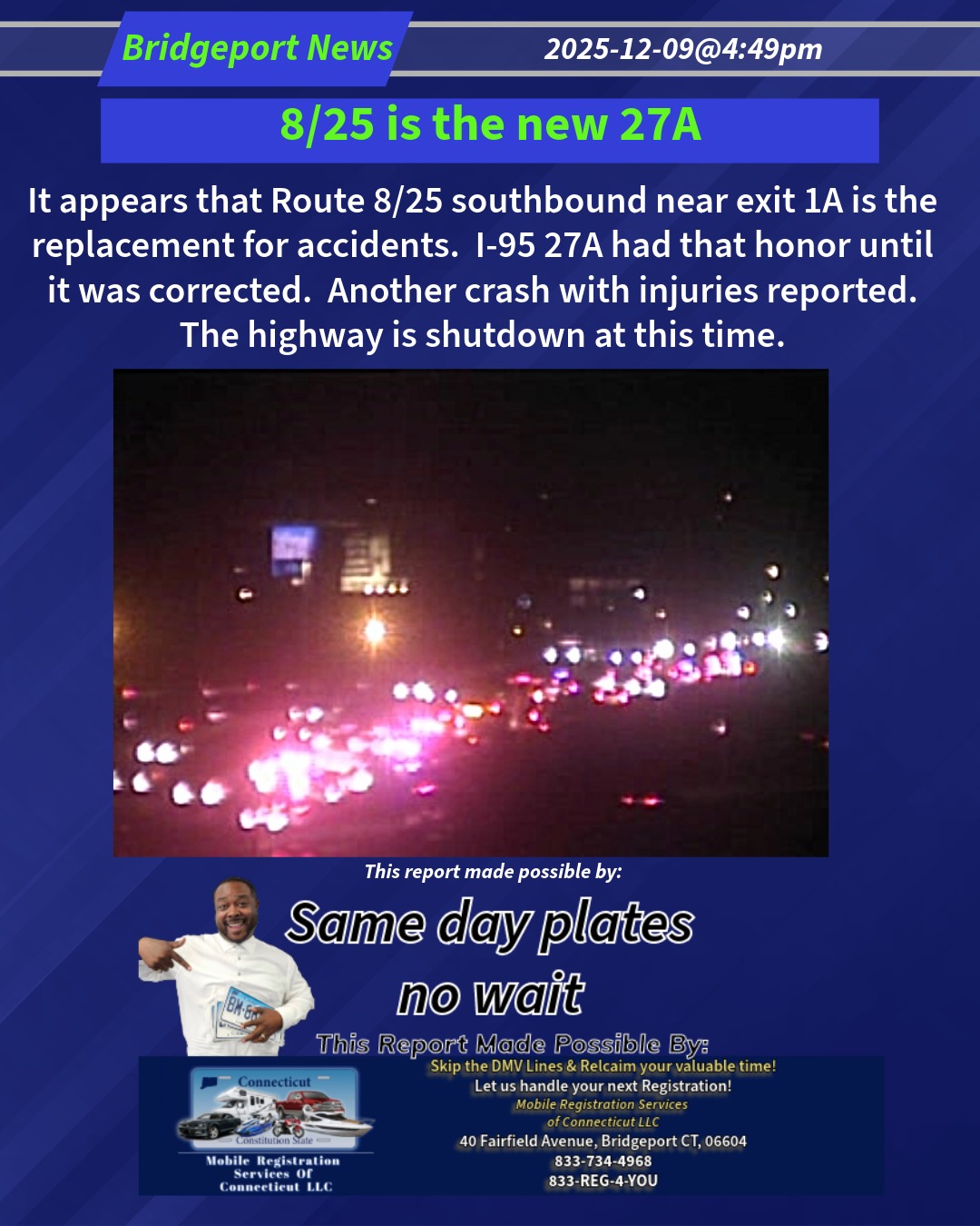 It appears that Route 8/25 southbound near exit 1A is the replacement for accidents. I-95 27A had that honor until it was corrected. Another crash with injuries reported. The highway is reportedly shutdown at this time.