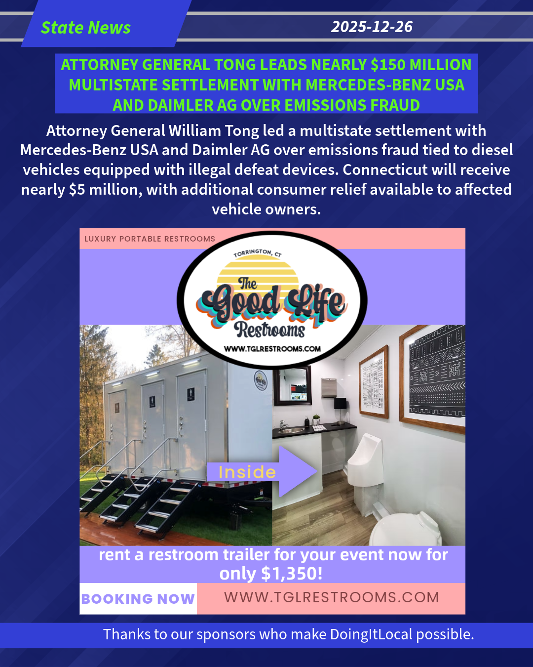 “Mercedes-Benz and Daimler hid devices inside their vehicles to cheat emissions tests, knowingly pumping out toxic emissions far exceeding legal limits. Their deception hurt their customers and harmed air quality for all Americans, and we’re holding them accountable. This settlement, as with others previously reached with Volkswagen and Fiat Chrysler, sends millions of dollars back to states as well as comprehensive relief for consumers who purchased these defective vehicles. Connecticut led the nationwide coalition reaching today’s settlement and will continue to lead in protecting consumers from bad actors who defraud and deceive the American people,” said Attorney General Tong.