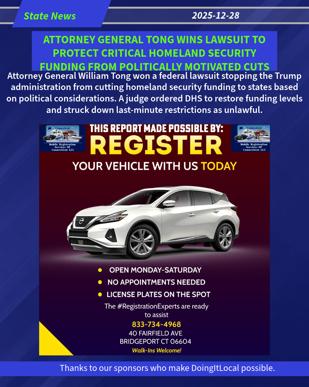 (Hartford, CT) – Attorney General William Tong has won a lawsuit to stop the Trump administration from unlawfully reallocating federal homeland security funding away from states based on their compliance with the administration’s political agenda. The U.S. District Court for the District of Rhode Island granted a motion for summary judgment brought by Attorney General Tong and a coalition of 11 other attorneys general and the governor of Pennsylvania.