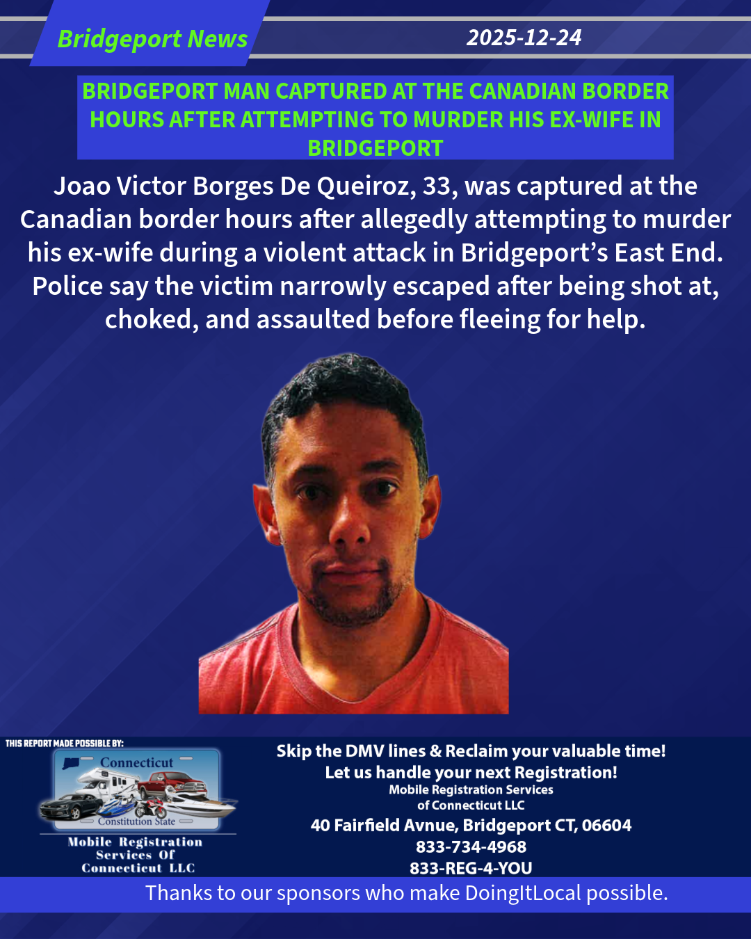 The quick capture of Borges De Queiroz was the result of a cohesive collaboration between the Bridgeport Police Department’s Patrol Division, Domestic Violence Unit, Warrants Unit and Homicide Unit, as well as United States Federal Law Enforcement and Canadian Law Enforcement.