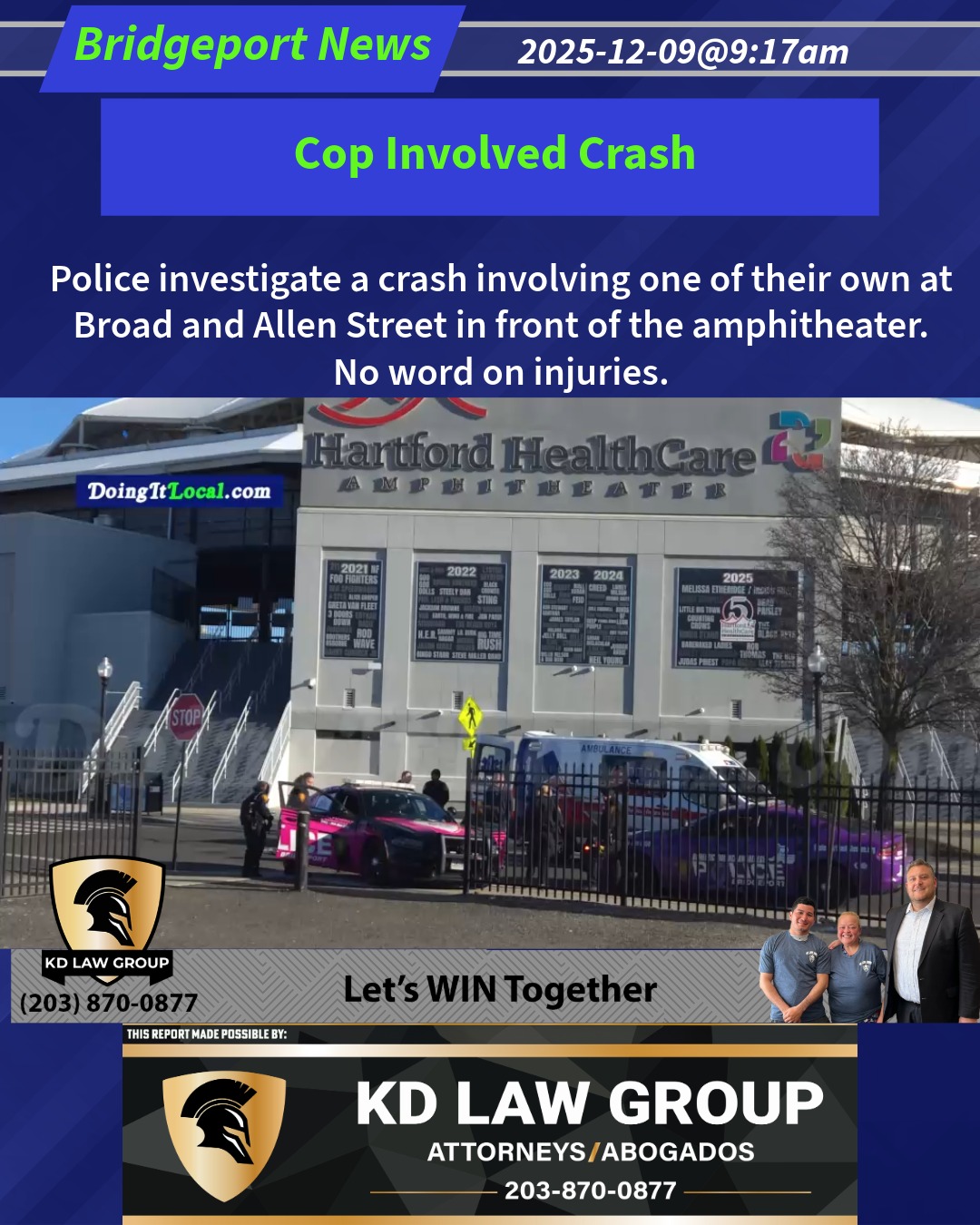 Police investigate a crash involving one of their own at Broad and Allen Street in front of the amphitheater. No word on injuries. Please note that this happened in front of the Hartford Amphitheater, but the accident occurred in Bridgeport, not Hartford.