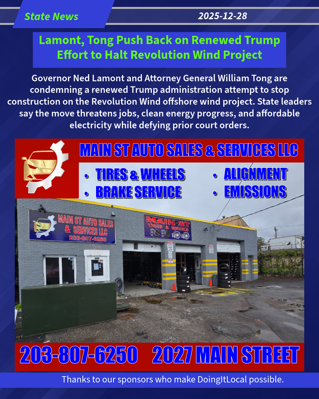 HARTFORD, CT — Governor Ned Lamont and Attorney General William Tong issued sharp rebukes following a new federal action by the Trump administration aimed at once again halting construction of the Revolution Wind offshore wind project, which is nearing completion.