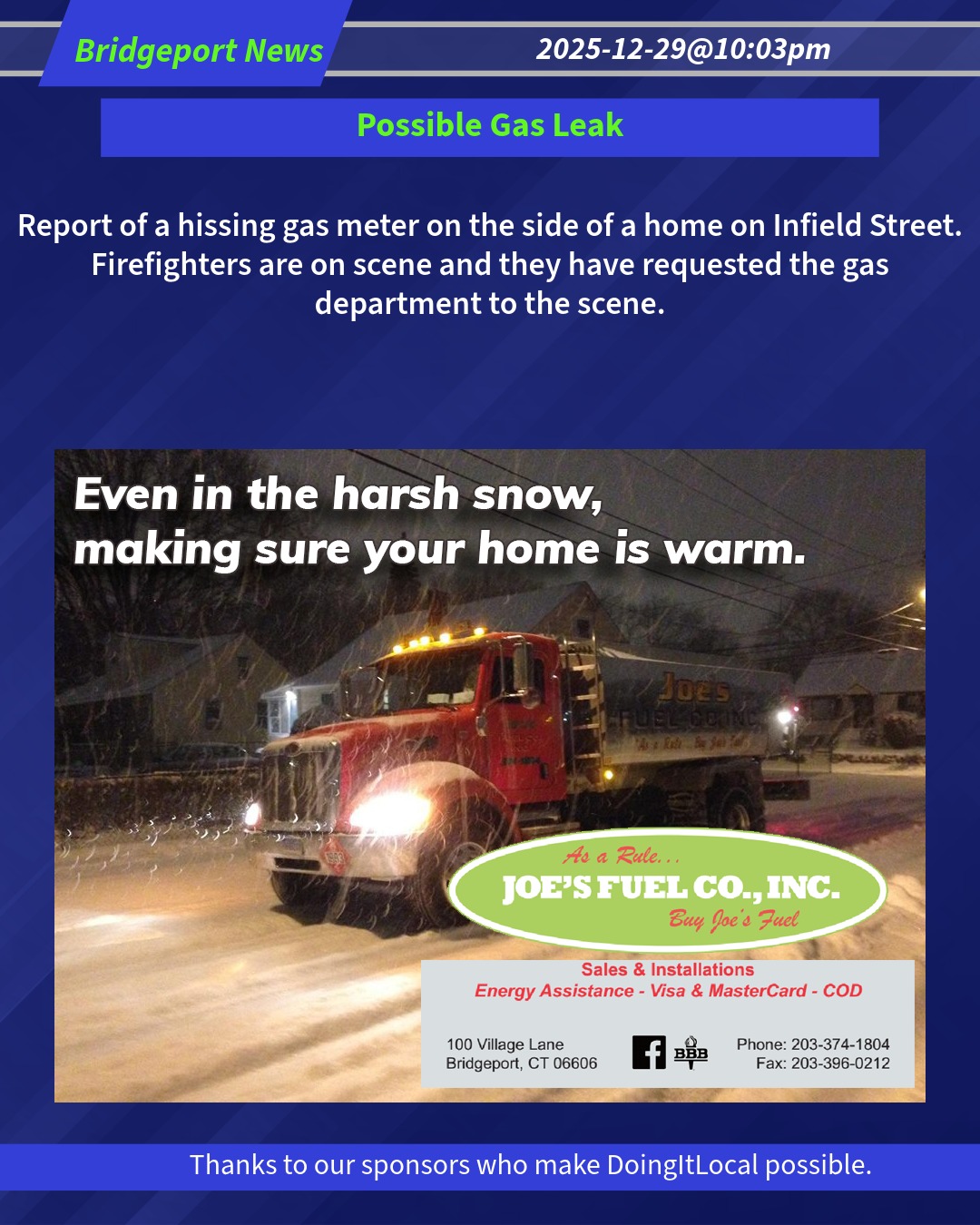 Report of a hissing gas meter on the side of a home on Infield Street. Firefighters are on scene and they have requested the gas department to the scene.