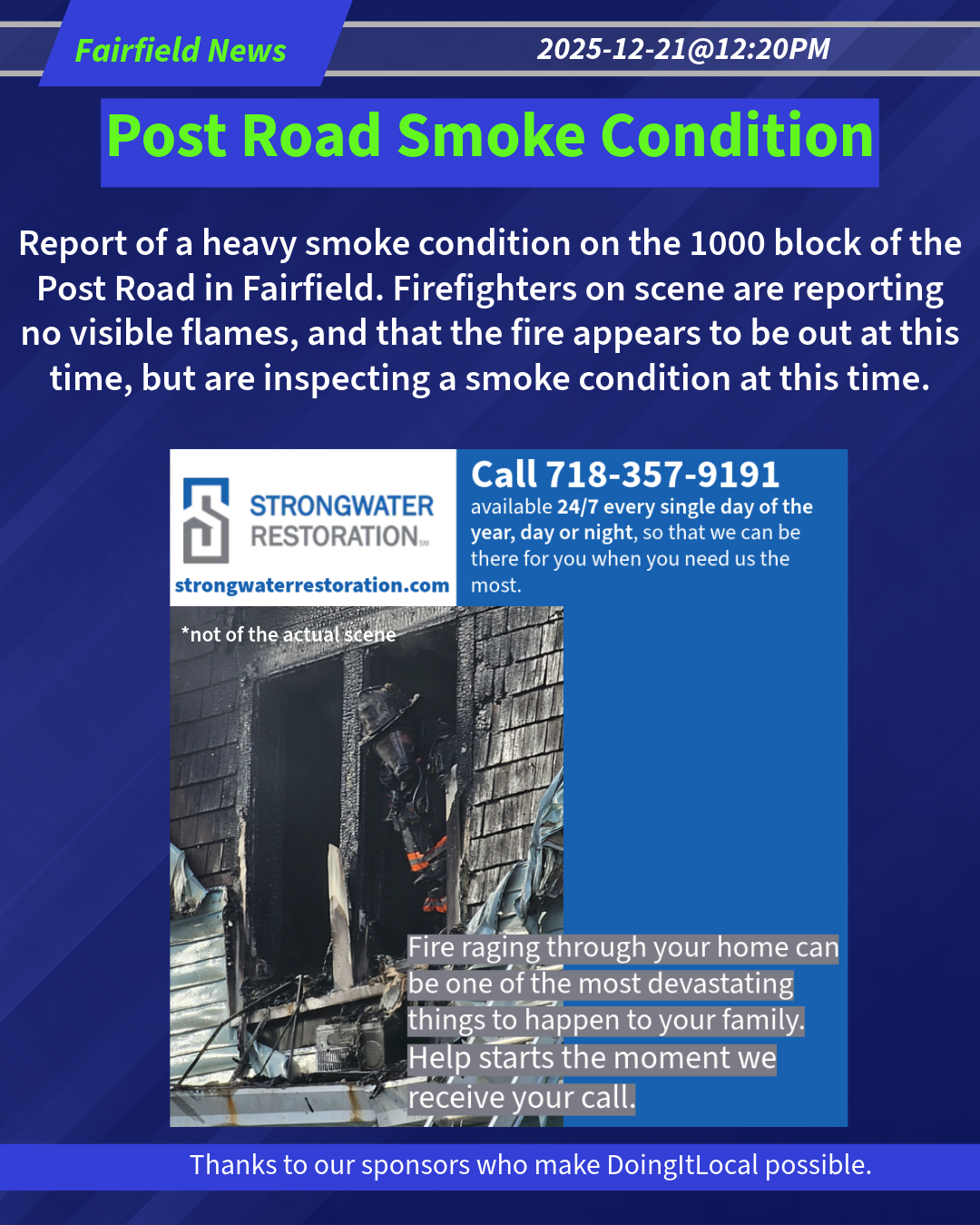 Report of a heavy smoke condition on the 1000 block of the Post Road in Fairfield. Firefighters on scene are reporting no visible flames, and that the fire appears to be out at this time, but are inspecting a smoke condition at this time.