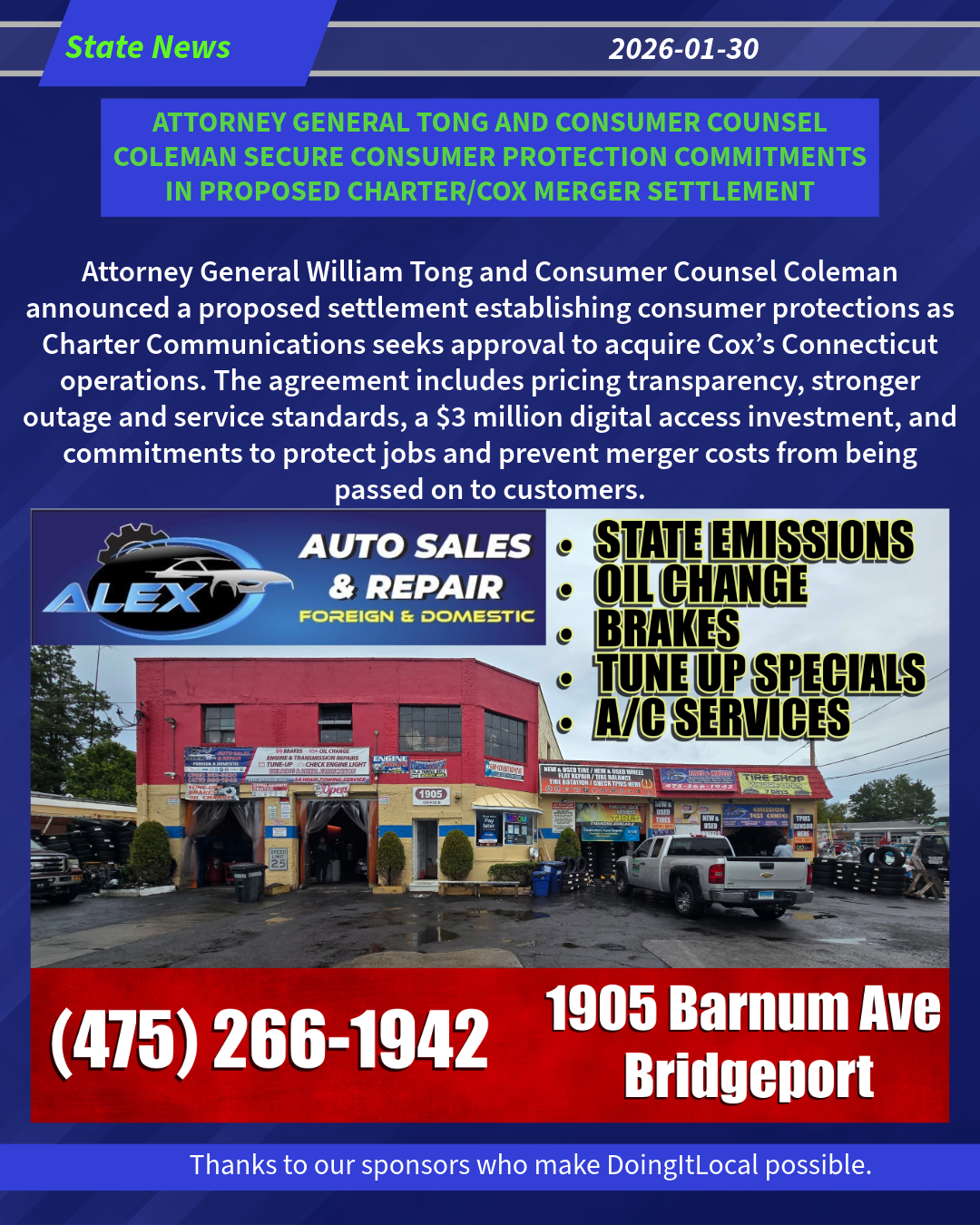 HARTFORD, CT – Today, Attorney General Tong and Consumer Counsel Coleman announced the filing of a comprehensive settlement that secures major consumer protections as Charter Communications seeks to move forward with acquiring Cox Communications and its Connecticut operations. The agreement, now before the Public Utilities Regulatory Authority (PURA) for approval, delivers more transparent pricing, stronger service reliability and outage reporting, resolves key customer protection issues, and provides for a $3 million investment in digital access and literacy in Charter’s expanded service territory, with a focus on distressed municipalities.