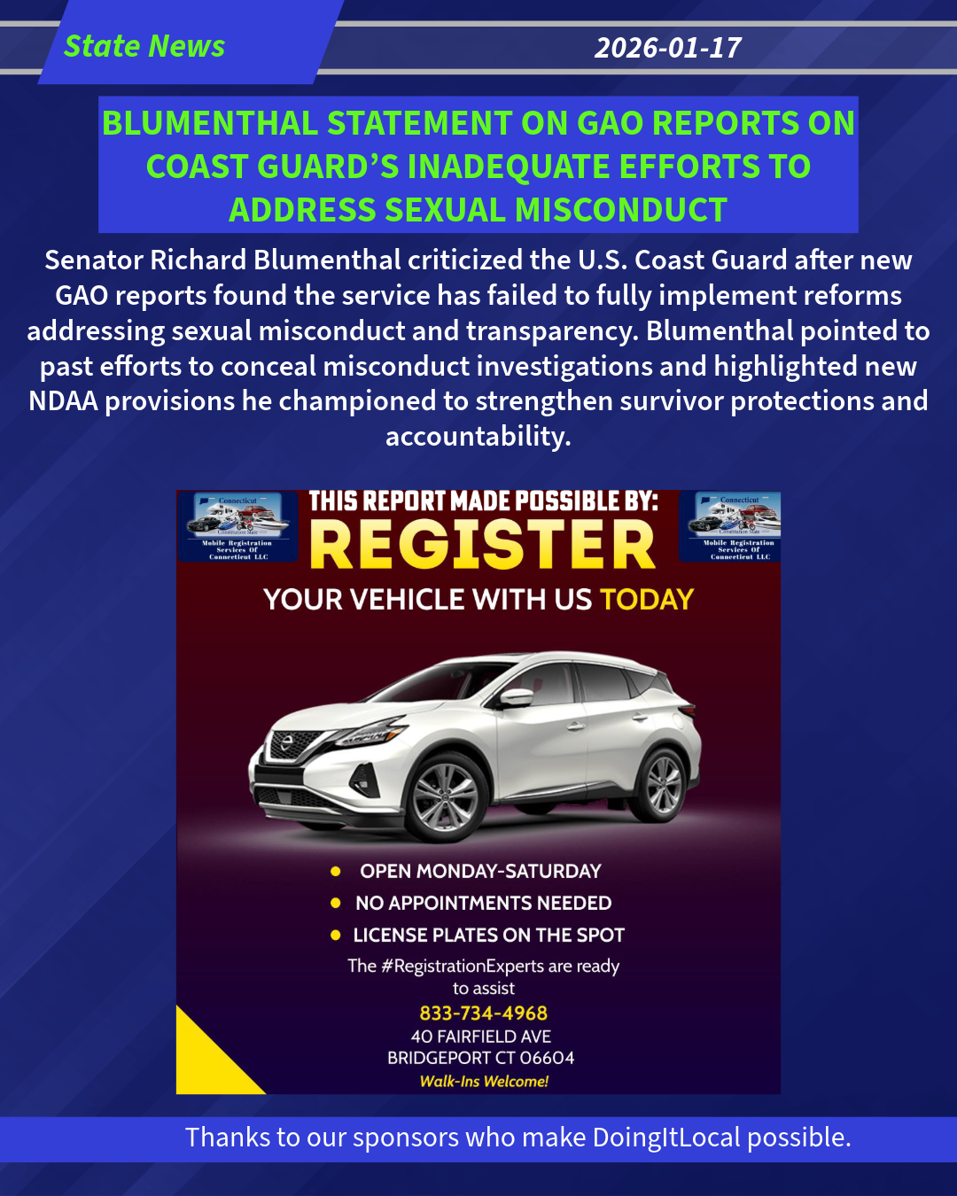 [WASHINGTON, DC] – U.S. Senator Richard Blumenthal (D-CT) released the below statement following the release of two reports by the Government Accountability Office (GAO) on the United States Coast Guard’s (USCG) efforts to implement reforms aimed at addressing sexual misconduct: