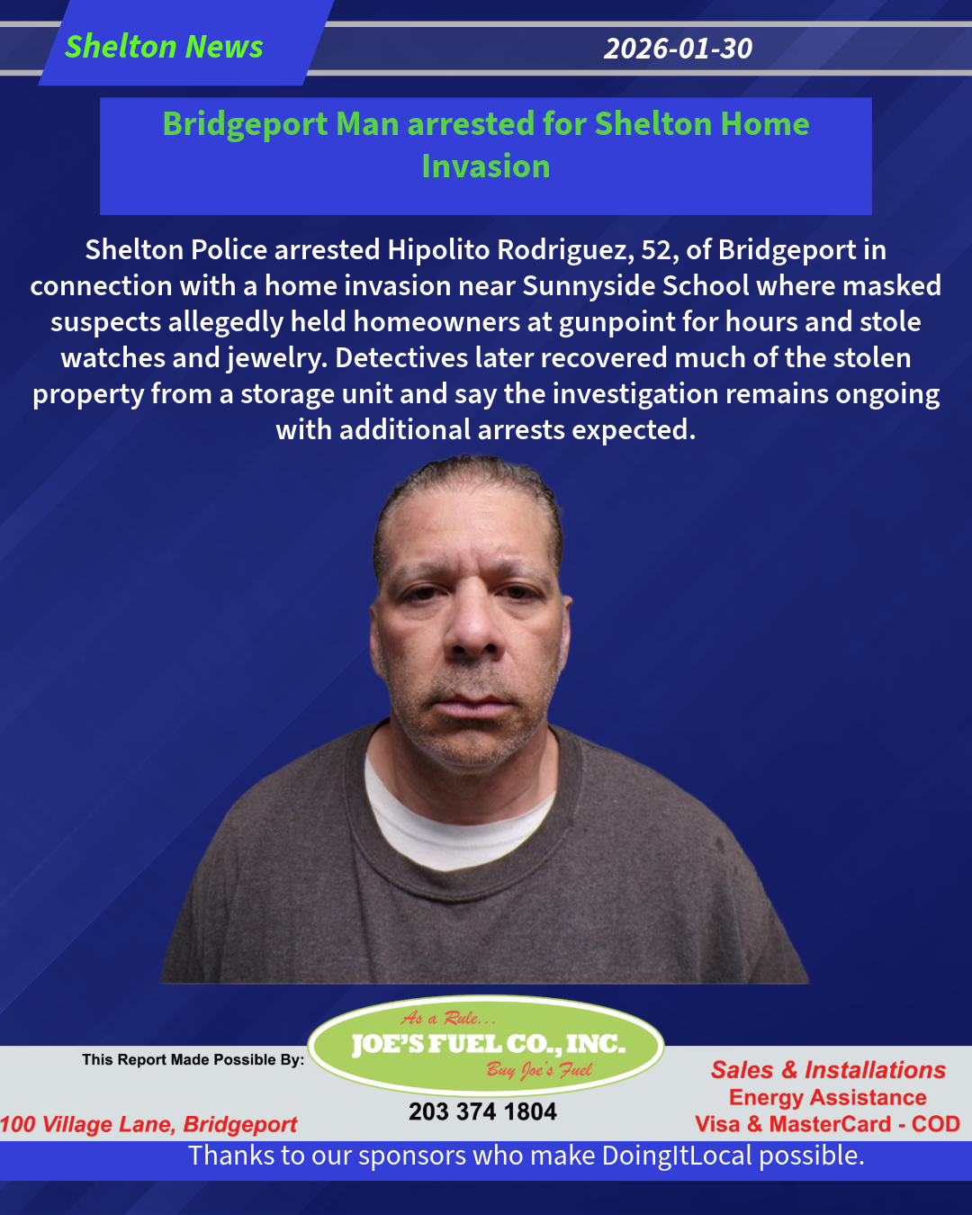 On 01/29/2026 Shelton Police arrested Hipolito Rodriguez, age 52, of Bridgeport for Home Invasion, Conspiracy to commit home invasion, Robbery 1st degree, and Conspiracy to commit Robbery 1st degree. Rodriguez was processed and charged at the Derby Superior Court and placed on $350,000.00 bond. Rodriguez is currently in custody of the department of corrections.