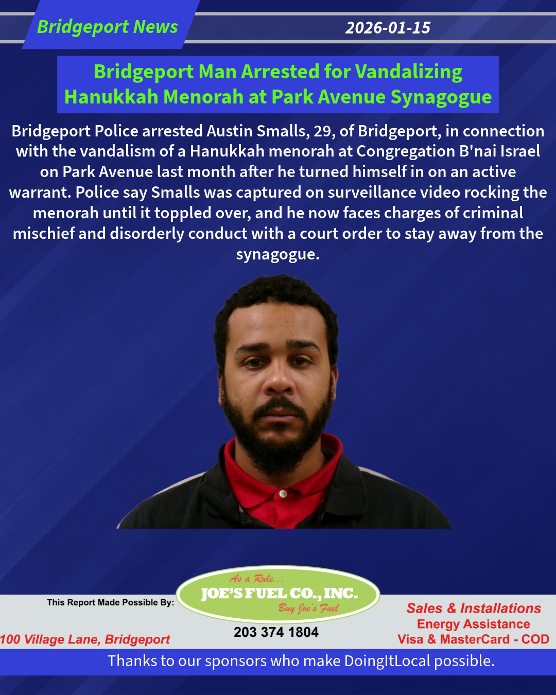 Hours later on 12/24/25, Smalls was arrested by Bridgeport Police in an unrelated incident several miles away. He was driving the same car and wearing the same clothing as seen in the surveillance video from the synagogue. Police had not yet been advised of the vandalism of the menorah at the time of that arrest.
