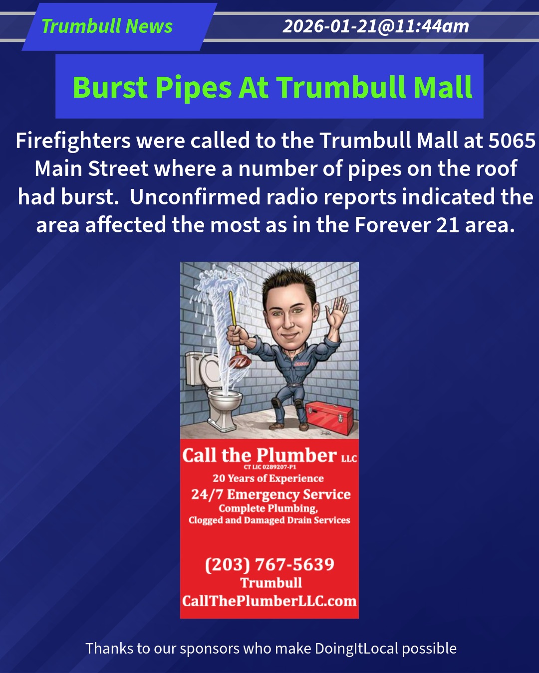 Firefighters were called to the Trumbull Mall at 5065 Main Street where a number of pipes on the roof had burst. Unconfirmed radio reports indicated the area affected the most as in the Forever 21 area.