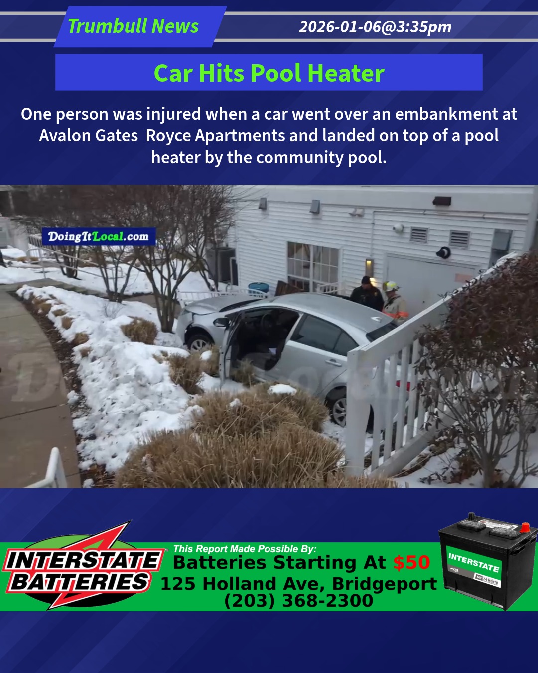 One person was injured when a car went over an embankment at Avalon Gates Royce Apartments and landed on top of a pool heater by the community pool.
