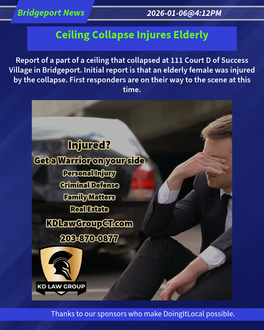 Report of a part of a ceiling that collapsed at 111 Court D of Success Village in Bridgeport. Initial report is that an elderly female was injured by the collapse. First responders are on their way to the scene at this time.