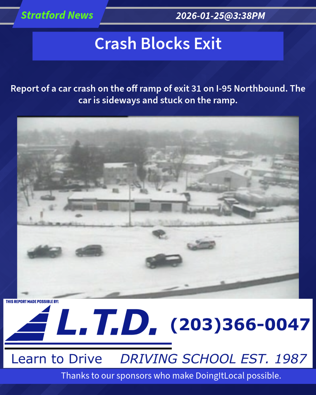 Report of a car crash on the off ramp of exit 31 on I-95 Northbound. The car is sideways and stuck on the ramp. Post navigation Stratford Library Teen February Programs