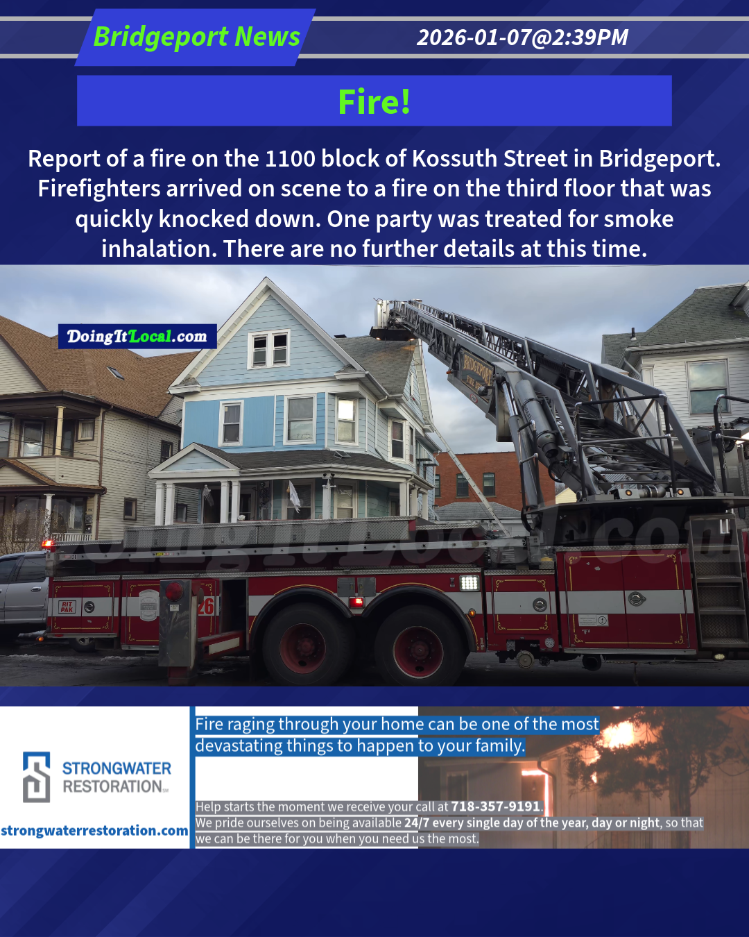 Report of a fire on the 1100 block of Kossuth Street in Bridgeport. Firefighters arrived on scene to a fire on the third floor that was quickly knocked down. One party was treated for smoke inhalation. There are no further details at this time.