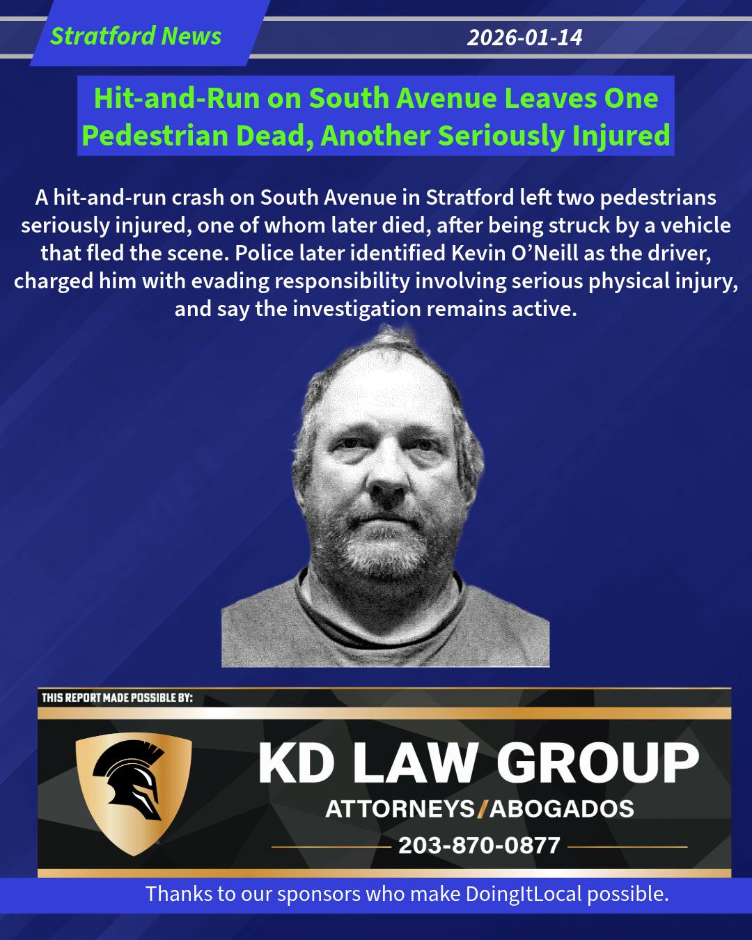 Kevin O’neill was transported to the Stratford Police Department and charged with Evading Responsibility-Serious Physical Injury and Operation of an Unregistered Motor Vehicle.