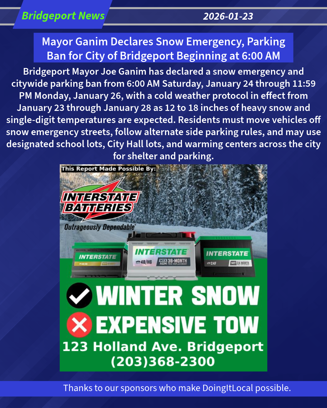Bridgeport, CT – In anticipation of the pending snowfall due to impact, Mayor Ganim is declaring a snow emergency for the city to take effect at 6:00 AM Saturday, January 24th to 11:59 PM Monday, January 26th. A cold weather protocol will also be in effect from 12:00 PM Friday, January 23rd to 12:00 PM Wednesday, January 28th. During a snow emergency, residents must move their cars off posted snow emergency streets and heed alternate side of street parking on all other streets. Snow emergency streets are marked with white signs with red lettering. A list of snow streets can be found on the City’s website bridgeportct.gov/snow.