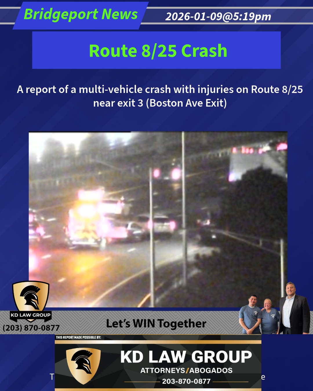 A report of a multi-vehicle crash with injuries on Route 8/25 near exit 3 (Boston Ave Exit)