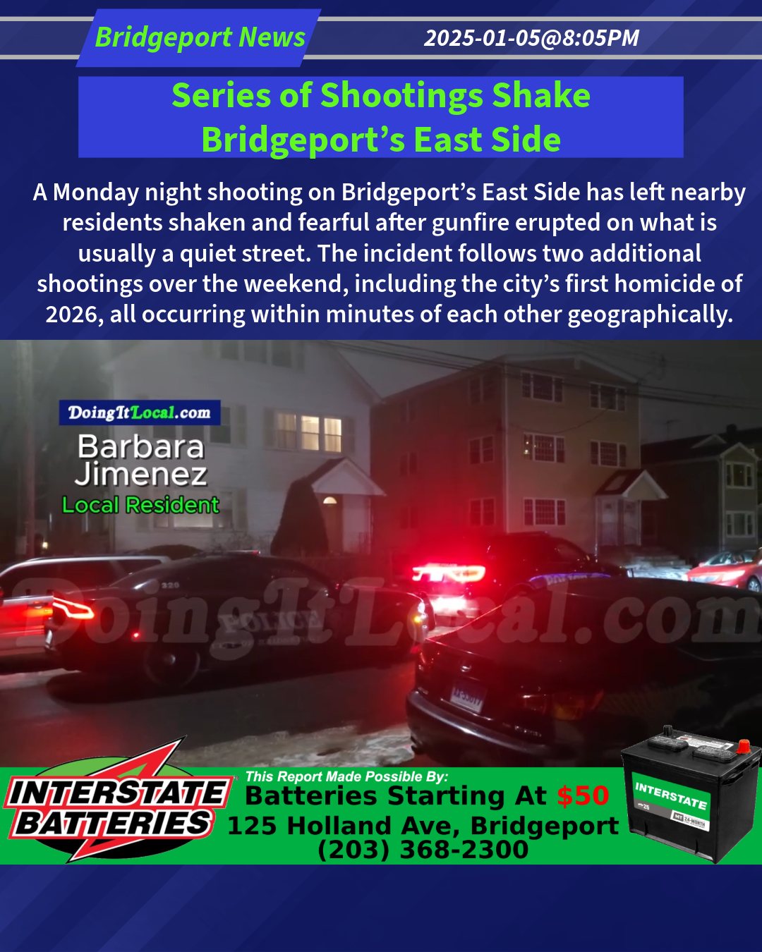 The most recent incident occurred Monday evening, January 5, 2026, near East Main Street and Edna Ave. According to the Bridgeport Police Department, multiple parties were involved in a verbal dispute outside when shots were fired. Police confirmed no injuries were reported and said the investigation remains ongoing.