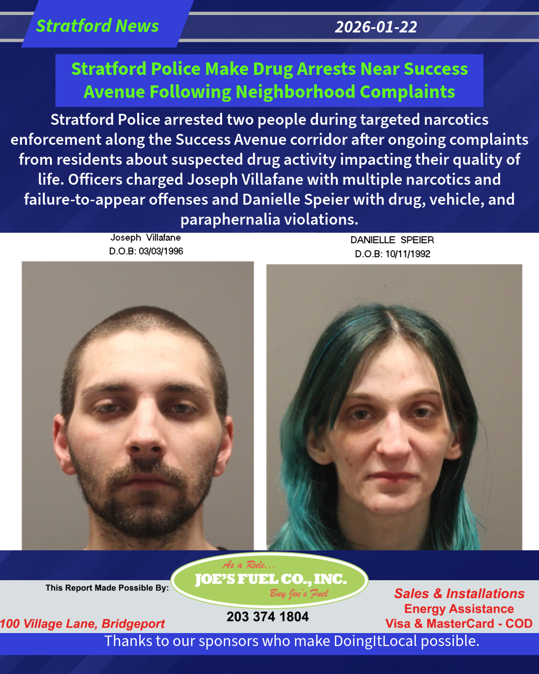 On January 16, 2026, the unit conducted targeted operations that resulted in two arrests. Joseph Villafane, a convicted felon, was charged with Failure to Appear in the First Degree, Illegal Possession of Narcotics 3rd Offense, and Illegal Possession of Crack/Cocaine 3rd Offense, along with additional failure-to-appear charges from other agencies, and is being held on bonds totaling $460,000 with a court date of January 30, 2026. Danielle Speier was charged with Illegal Possession of Drug Paraphernalia, Illegal Possession of a Controlled Substance (two counts), Improper Use of a License Plate, Operation of an Unregistered Vehicle, and Illegal Operation without Insurance, and was held on a $5,000 bond with a January 28, 2026 court date.
