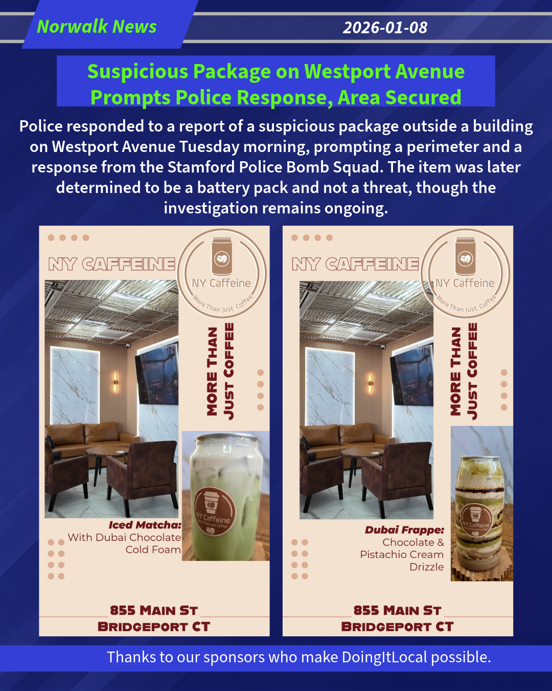 Norwalk, CT — January 6, 2026 — Norwalk Police Department responded to a report of a suspicious package Tuesday morning on Westport Avenue, prompting a temporary perimeter and assistance from regional resources.