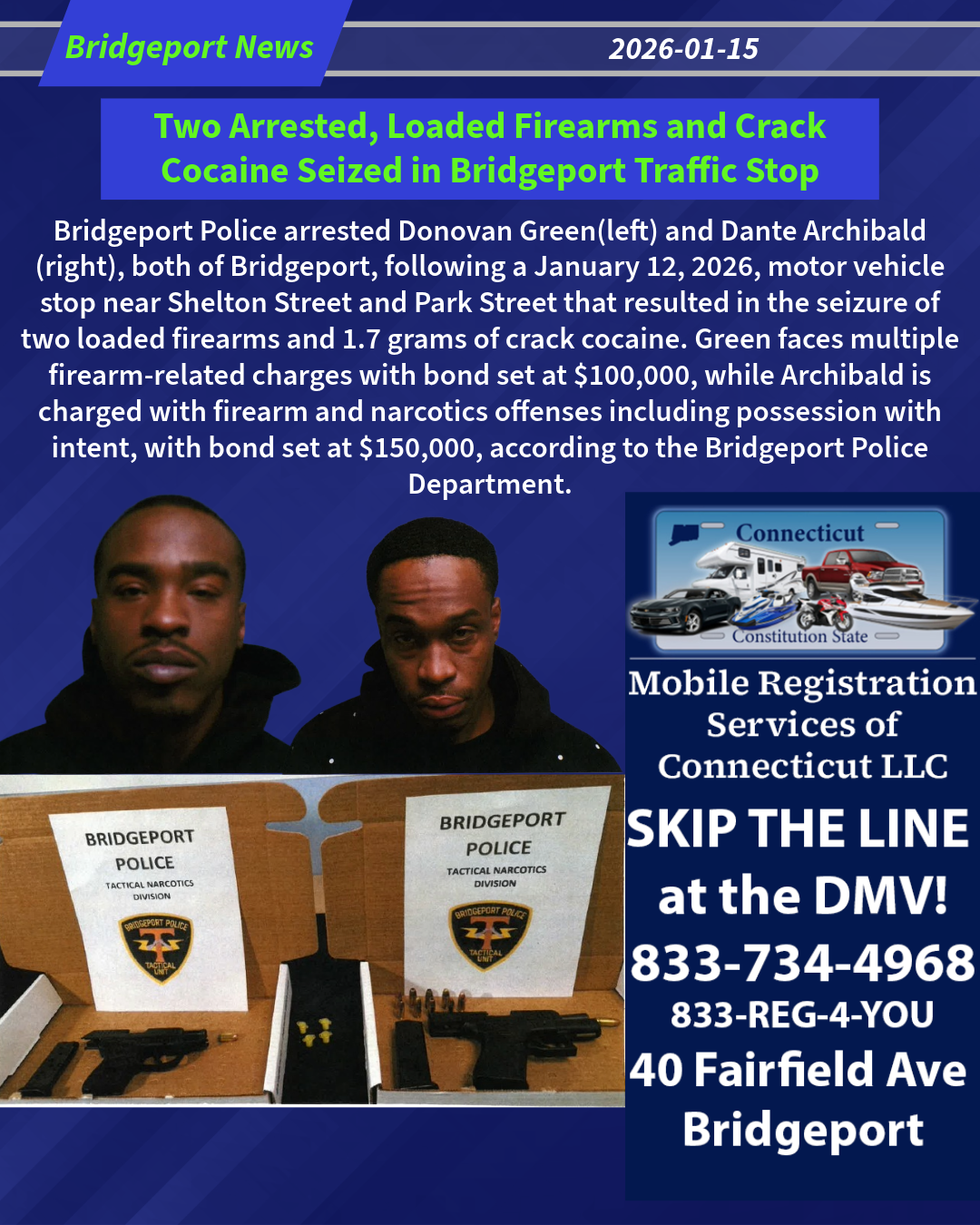 Bridgeport Tactical Narcotics Unit, along with the Patrol Division announce the successful arrest and seizure of Donovan Green of Bridgeport and Dante Archibald of Bridgeport, resulting from a motor vehicle stop in the area of Shelton St. and Park St.