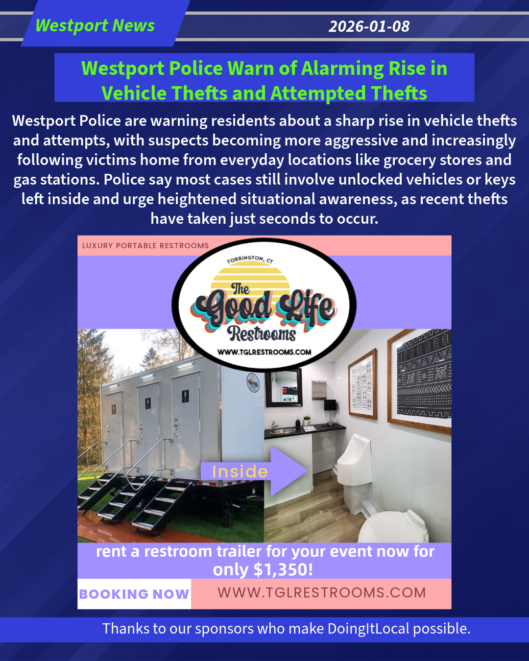 Westport, CT — January 7, 2026 — The Westport Police Department is urging residents and visitors to remain vigilant following an alarming trend identified in recent investigations involving stolen vehicles and attempted vehicle thefts.