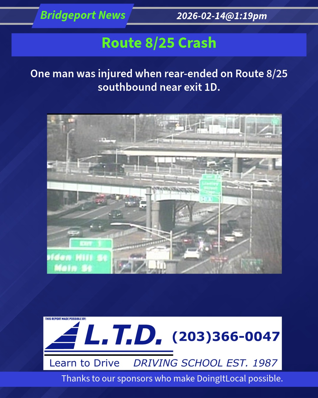 One man was injured when rear-ended on Route 8/25 southbound near exit 1D.