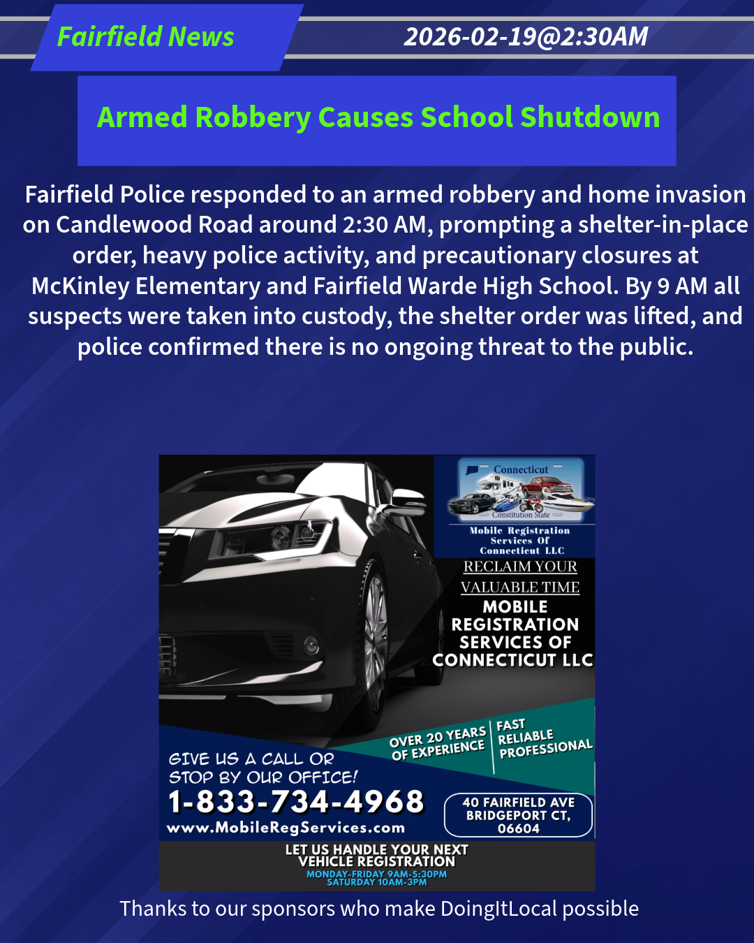 Officers responded just before 2:30 AM on Thursday, February 19, 2026 to reports of an armed robbery and possible home invasion. Police quickly secured the victims and initially detained one suspect, while another person of interest was later located in Hamden. Investigators then worked to locate two additional suspects believed to still be in the immediate area, leading to a significant police presence around Candlewood Road and Black Rock Turnpike and instructions for nearby residents to shelter in place and avoid the area.