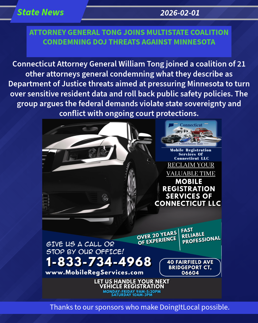 Attorney General Tong and the coalition make clear that their states will continue to stand firm against unlawful federal interference and will defend both state sovereignty and the rights of their residents. The coalition urges the administration to end its dangerous and unlawful campaign against Minnesota immediately and stand down its alarming demands.