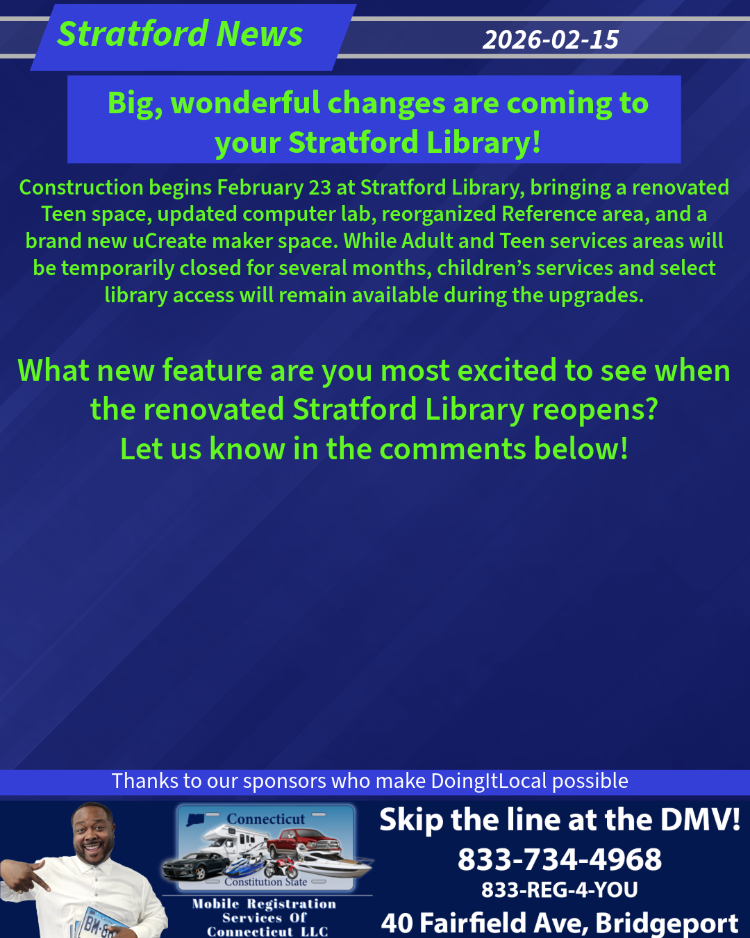 Starting Wednesday February 23, we will be undergoing construction. When it is finished, Stratford Library will have a renovated Teen space, a reorganized Reference space, an updated public computer lab, and a brand new uCreate maker space. There will be new lighting, new ductwork, a new ceiling and new heating and cooling systems.