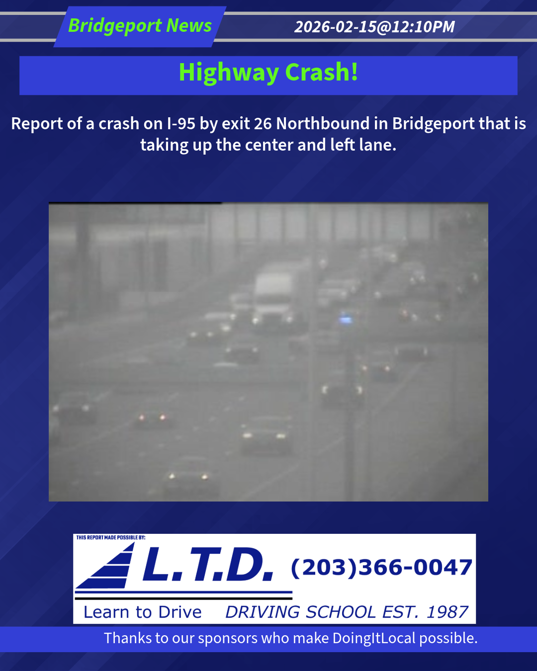 Report of a crash on I-95 by exit 26 Northbound in Bridgeport that is taking up the center and left lane.