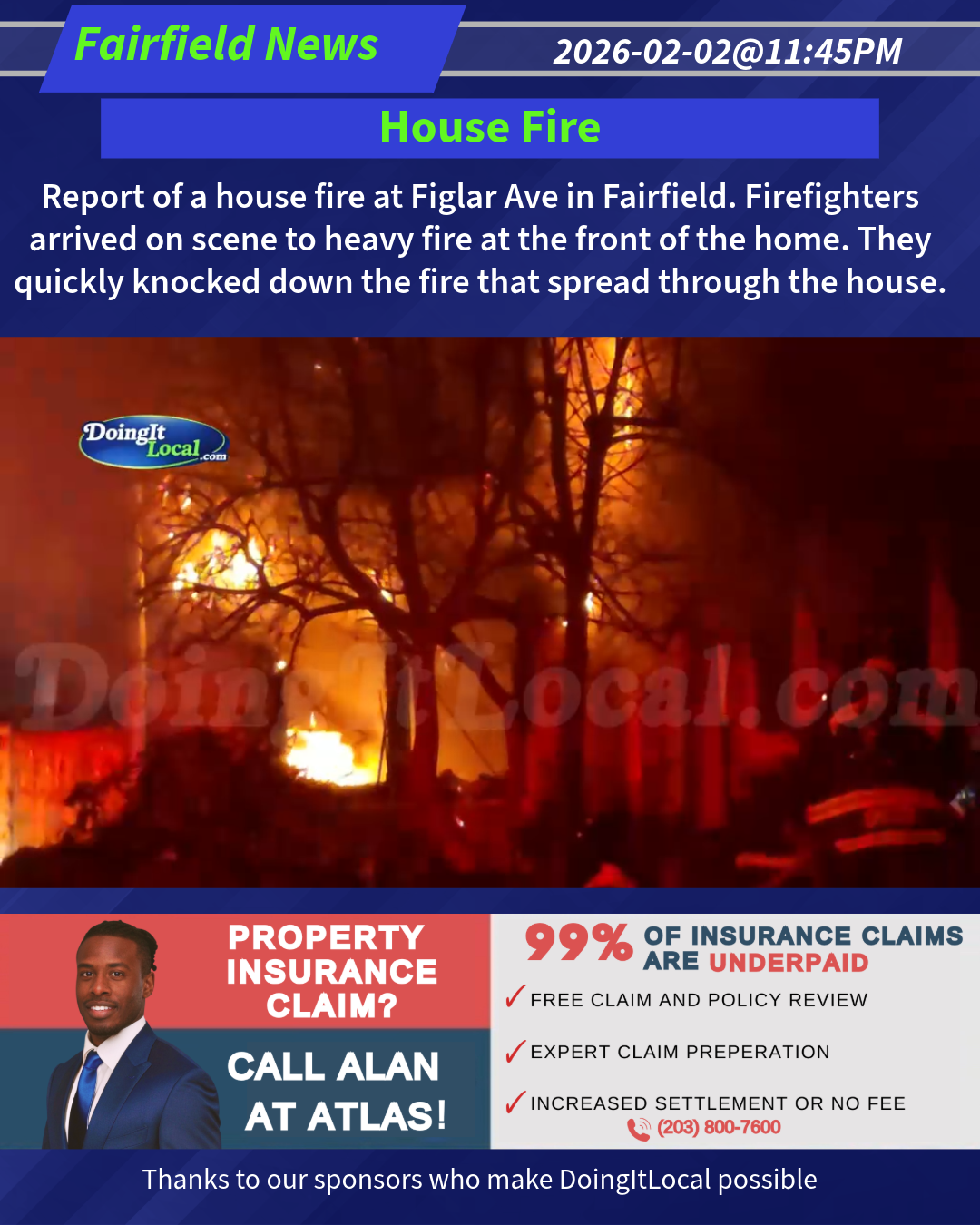 Report of a house fire at Figlar Ave in Fairfield. Firefighters arrived on scene to heavy fire at the front of the home. They quickly knocked down the fire that spread through the house.
