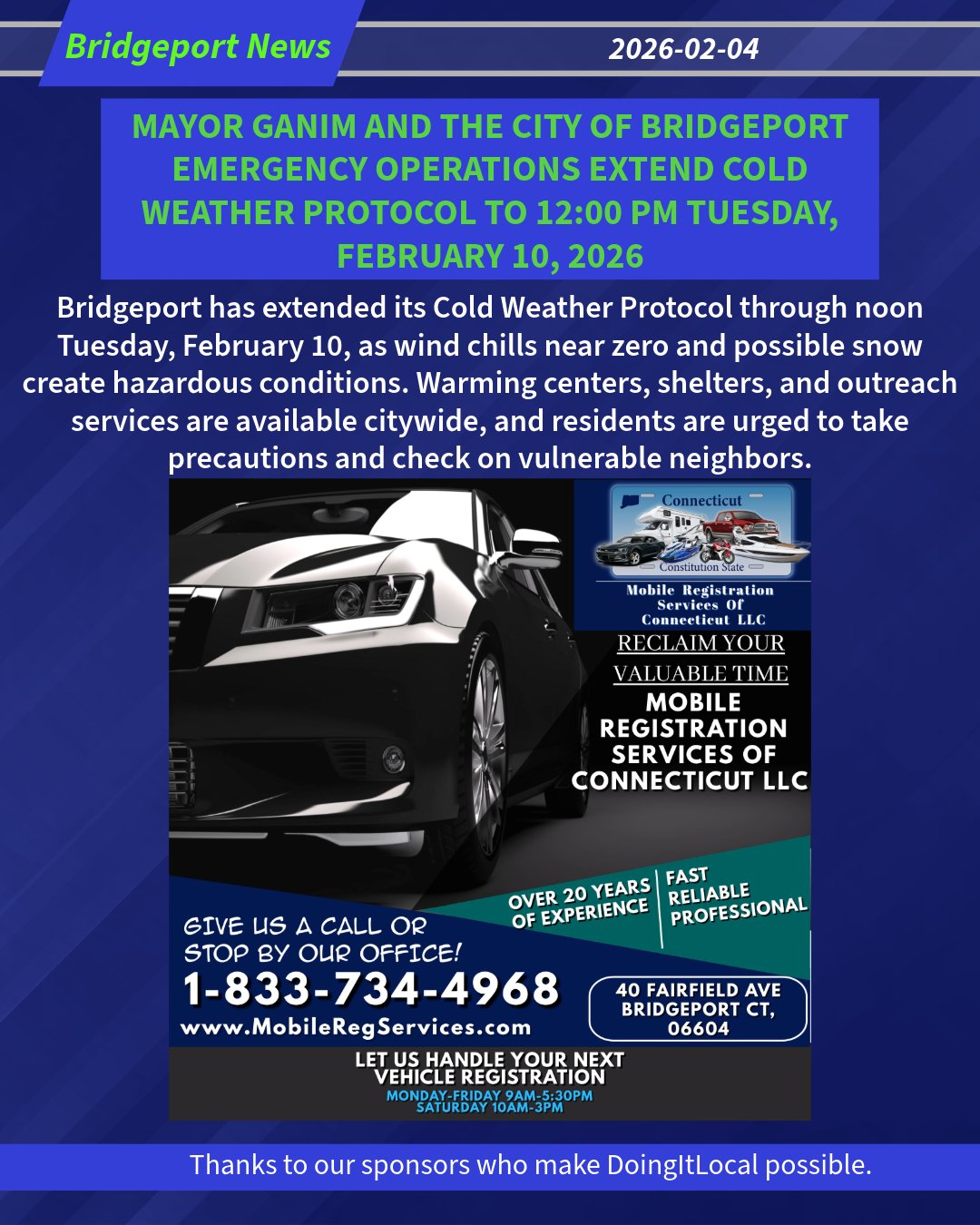 BRIDGEPORT, CT – Mayor Ganim and the Office of Emergency Management advise all residents to be cautious until noon Tuesday, February 10, 2026, due to the extension of the Cold Weather Protocol. A period of intense cold will impact the Bridgeport area, with very low wind chill values forecast near zero.