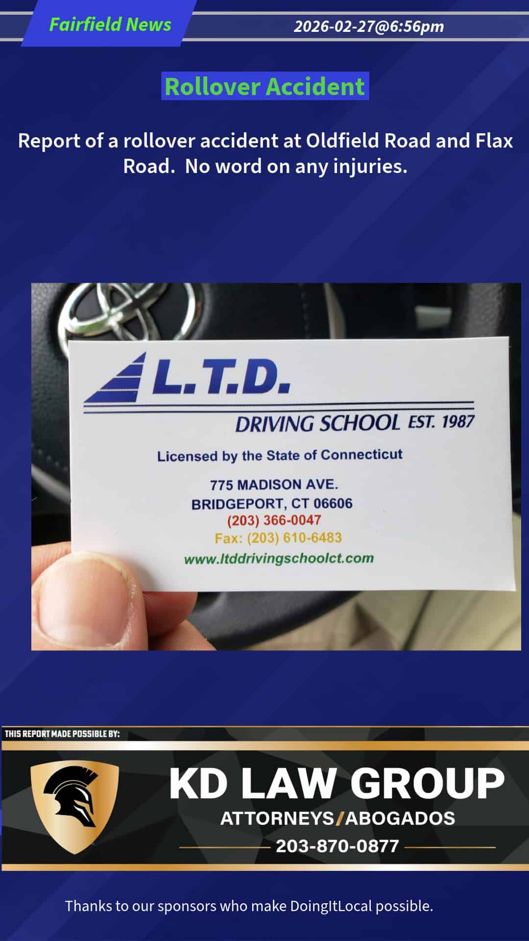Report of a rollover accident at Oldfield Road and Flax Road. No word on any injuries.