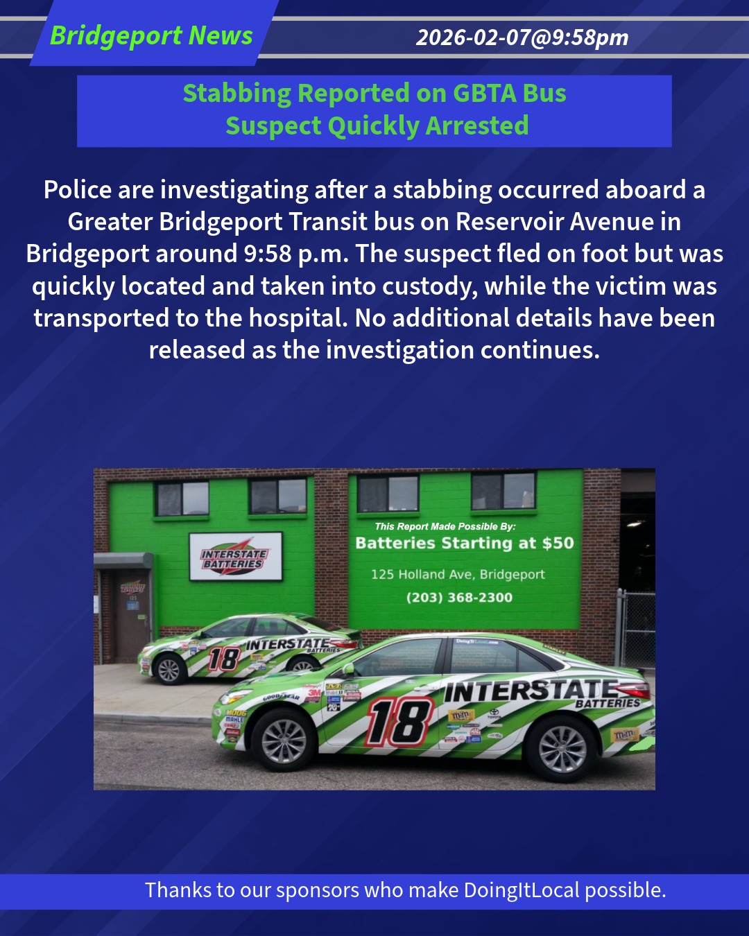 Police are investigating after a stabbing occurred aboard a Greater Bridgeport Transit bus on Reservoir Avenue in Bridgeport around 9:58 p.m. The suspect fled on foot but was quickly located and taken into custody, while the victim was transported to the hospital. No additional details have been released as the investigation continues.