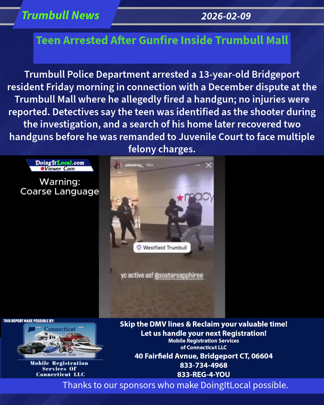 Trumbull Police arrested a thirteen (13) year-old Bridgeport resident for firing a handgun during a dispute at the Trumbull Mall in December. The youth was apprehended just after 8:00 a.m. Friday, February 6, 2026, near his home after he ran from detectives who approached him to serve the active arrest warrant. He was charged with Attempted Assault 1st Degree, and Illegal Discharge of a Firearm, Reckless Endangerment 1st Degree, as well as other related crimes.
