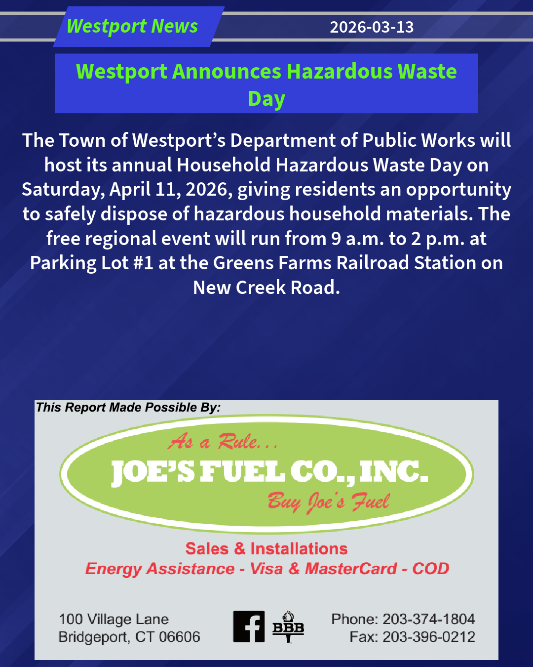 Household Hazardous Waste Day is a NO CHARGE regional program for residents of Westport, Norwalk, New Canaan, Darien, Stamford, and Greenwich to safely dispose of their household hazardous wastes. Products such as cleaners, gasoline and pesticides can pollute the environment and jeopardize public health when they are disposed of improperly.