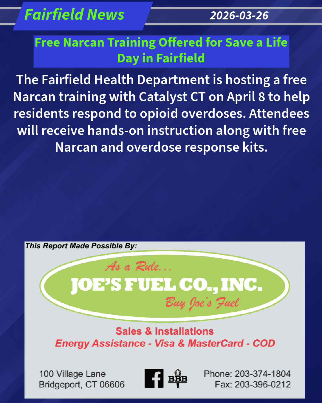 In recognition of Save a Life Day on April 8, the Fairfield Health Department, in partnership with Catalyst CT, and Fairfield Public Library, will host a FREE Narcan (naloxone) training to help residents recognize and respond to opioid overdoses.