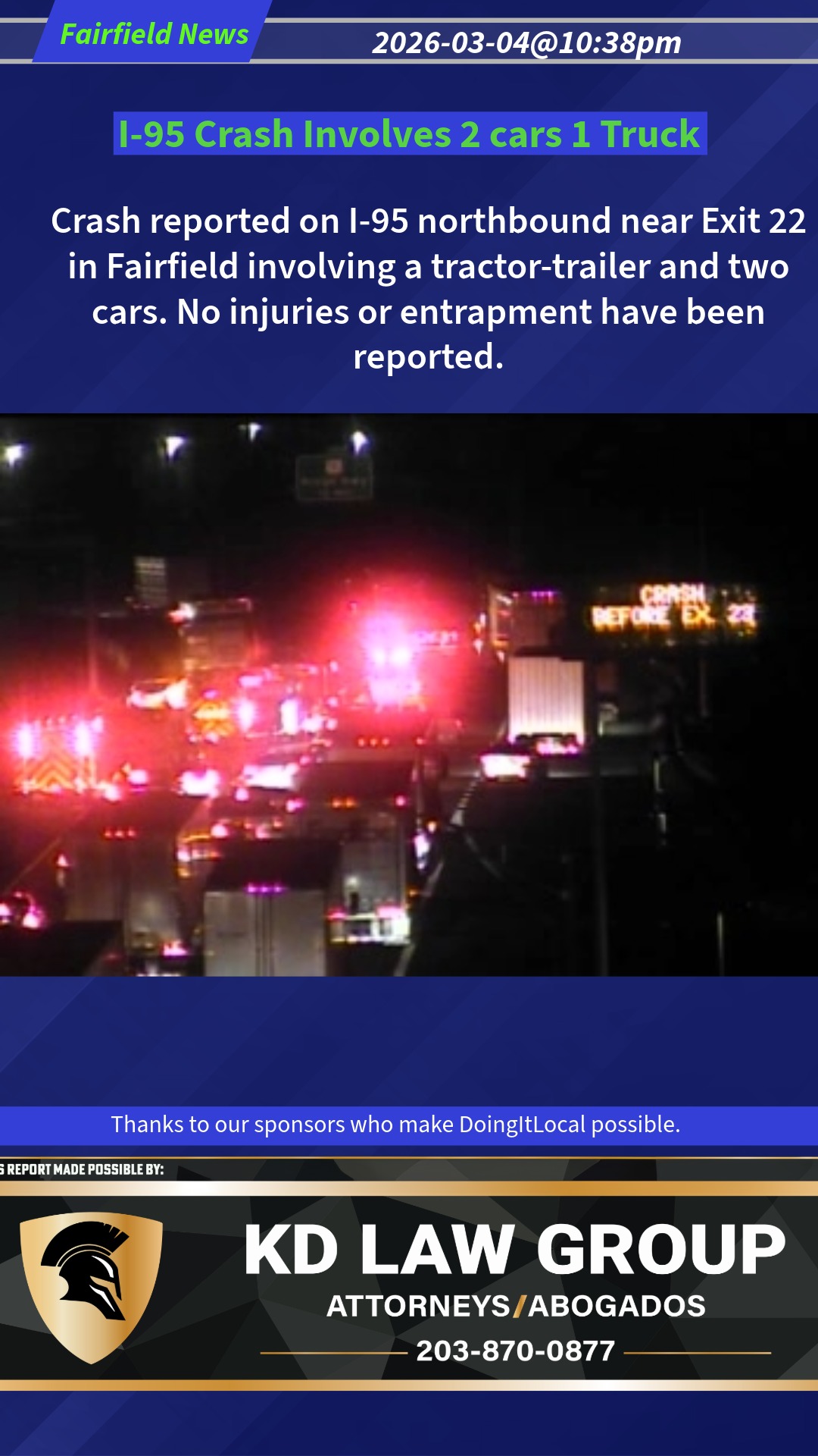 Crash reported on I-95 northbound near Exit 22 in Fairfield involving a tractor-trailer and two cars. No injuries or entrapment have been reported.