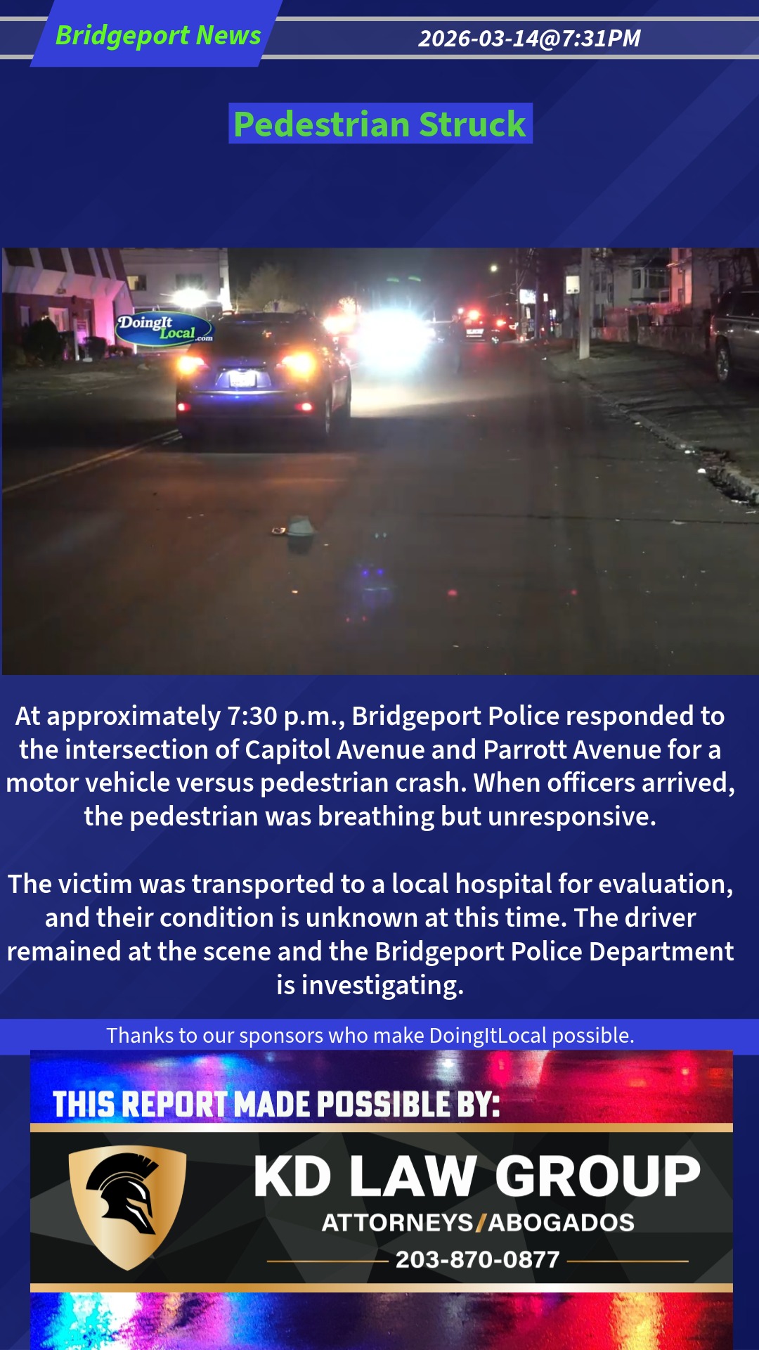 At approximately 7:30 PM the Bridgeport Police responded to the intersection of Capitol Avenue and Parrott Avenue for a motor vehicle versus pedestrian crash. When officers arrived, the pedestrian was breathing but unresponsive.