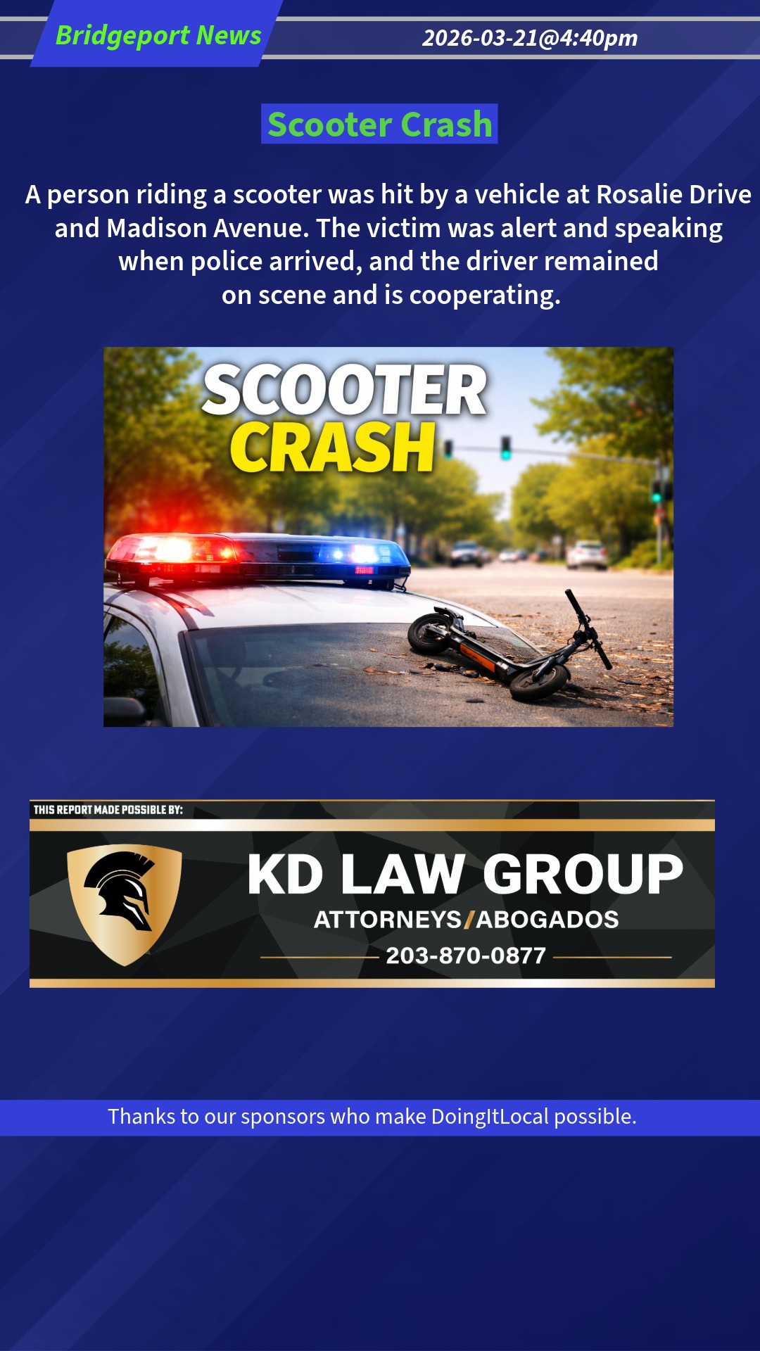 A person riding a scooter was hit by a vehicle at Rosalie Drive and Madison Avenue. The victim was alert and speaking when police arrived, and the driver remained on scene and is cooperating. 2026-03-21@4:40pm