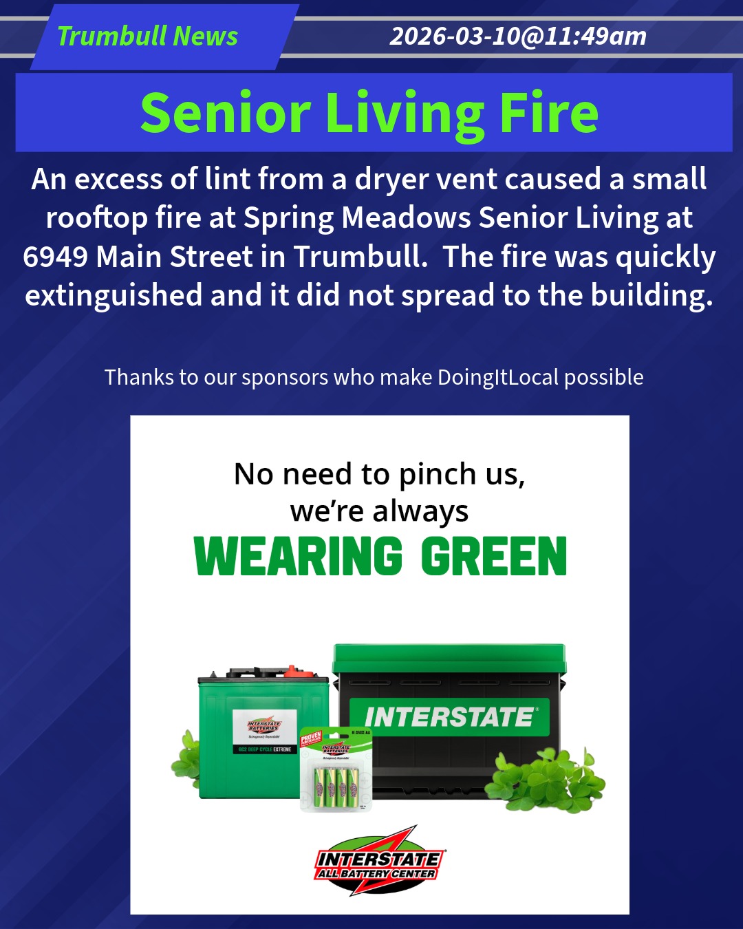An excess of lint from a dryer vent caused a small rooftop fire at Spring Meadows Senior Living at 6949 Main Street in Trumbull. The fire was quickly extinguished, and it did not spread to the building.