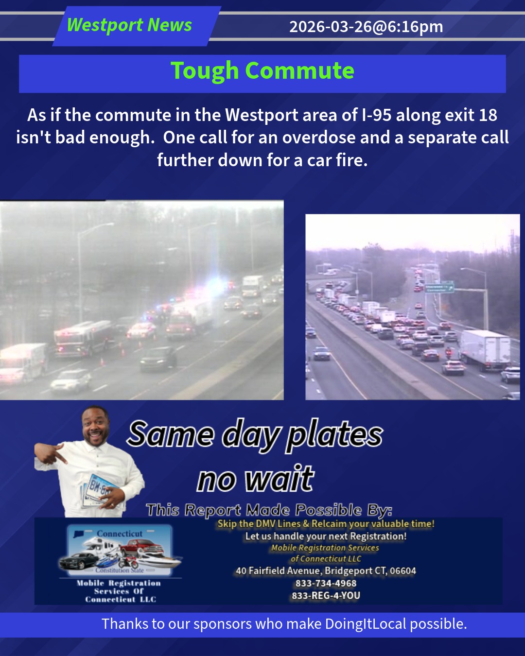 As if the commute in the Westport area of I-95 along exit 18 isn’t bad enough. One call for an overdose and a separate call further down for a car fire.