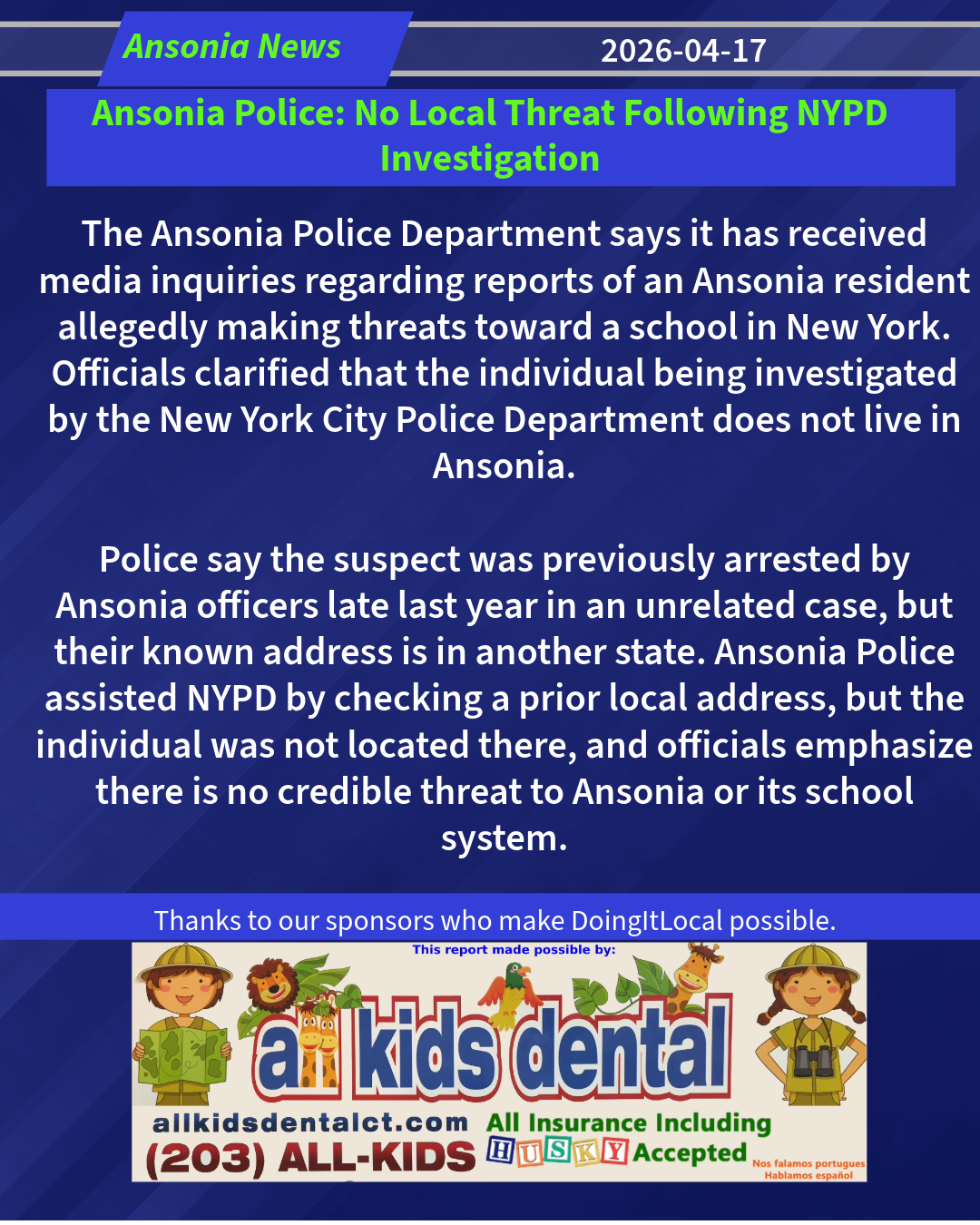Police say the suspect was previously arrested by Ansonia officers late last year in an unrelated case, but their known address is in another state. Ansonia Police assisted NYPD by checking a prior local address, but the individual was not located there, and officials emphasize there is no credible threat to Ansonia or its school system.