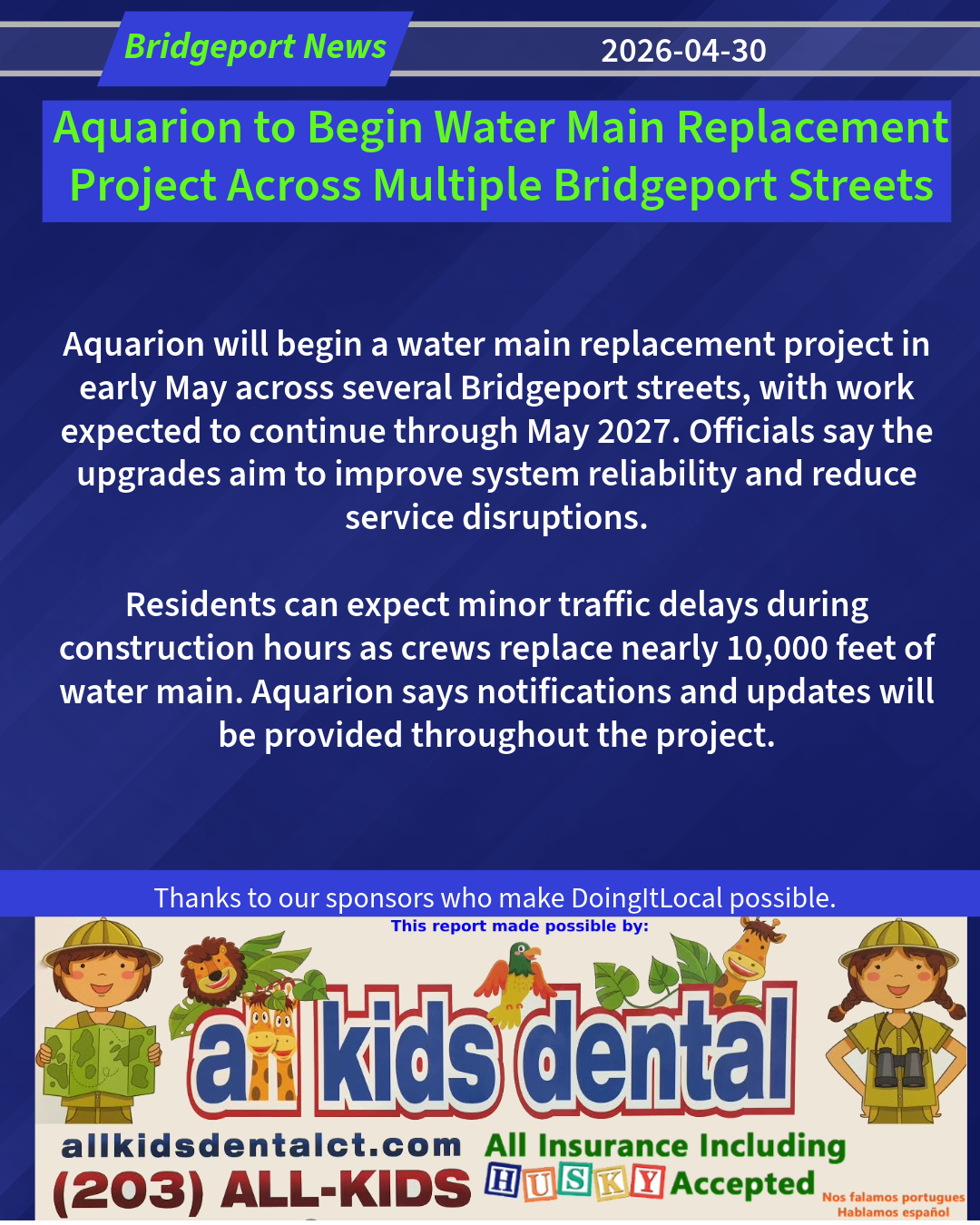 Aquarion Water Company continues to perform essential work on infrastructure necessary to ensure continued system reliability. The water main replacement project is scheduled to begin in early May 2026 on Abner Court, followed by Albermarie Street, Ameridge Drive, Cherry Hill Drive, D’Eramo Place, Glendale Avenue, Jewett Avenue, Marconi Avenue, Martha Place, Plankton Street, Primrose Avenue, and Ruth Street. The project is expected to be completed by May 2027. Final paving will then be scheduled in coordination with the City of Bridgeport.