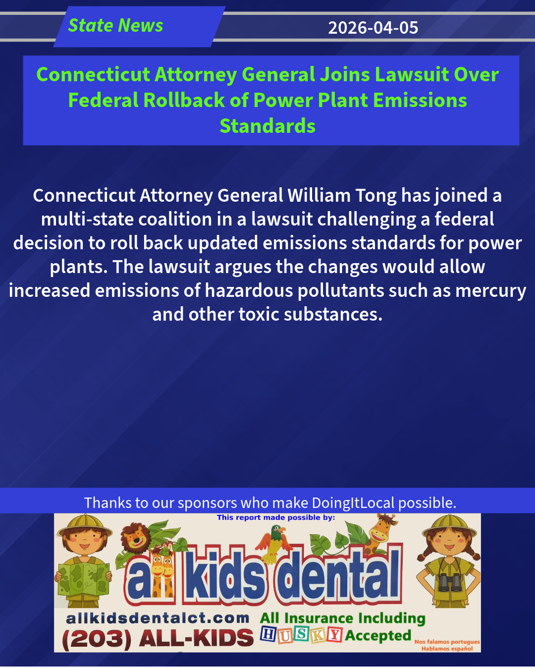(Hartford, CT) — Attorney General William Tong joined a coalition of # states and local governments in filing a lawsuit challenging the Trump administration’s repeal of the 2024 Mercury and Air Toxics Standards (MATS) Rule and reversion to outdated standards that harm the environment and public health.
